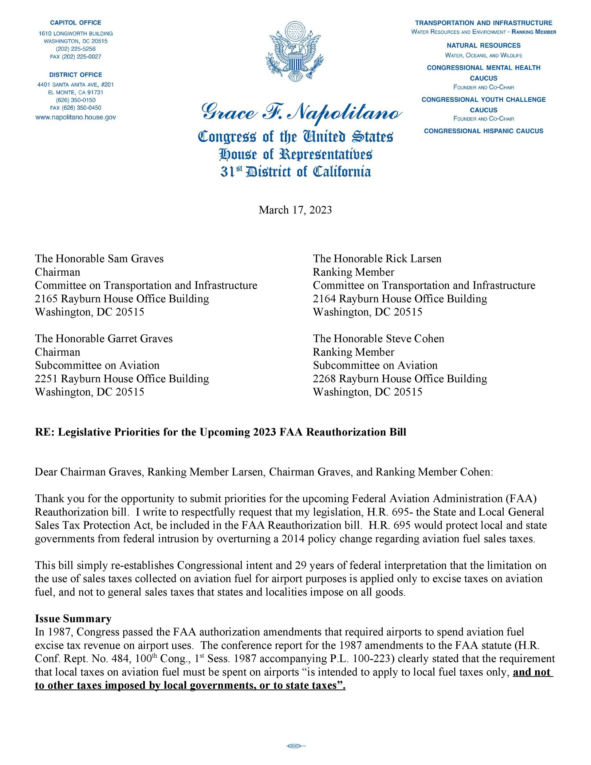This collection contains documents relating to H.R. 695, the State and Local General Sales Tax Protection Act, to be included in the FAA Reauthorization bill. H.R. 695 would protect local and state governments from federal government intrusion in the use of their general sales tax revenues. Documents include: a letter of support from Grace Napolitano to the Committee on Transportation and Infrastructure, and the Subcommittee on Aviation, a copy of the bill H.R. 3713, a fact sheet, a letter from Grace Napolitano and Brian Fitzpatrick to colleagues asking for support, and support letters from Mental Health Liaison Group (MHLG) and the National Education Association (NEA). (Click on the main image to view all documents.)Context