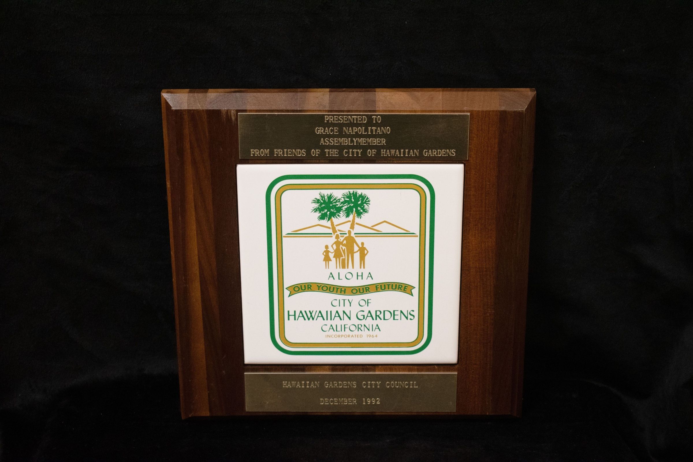 Tile mounted inside a wooden plaque from the City of Hawaiian Gardens reading "Presented to Grace Napolitano Assemblymember, from friends of the city of Hawaiian Gardens, Hawaiian Gardens City Council, December 1992."Collection