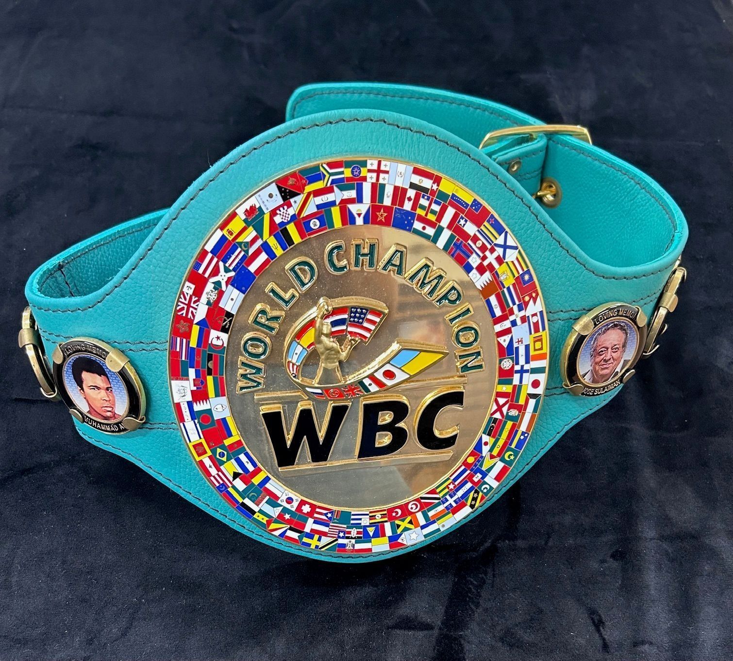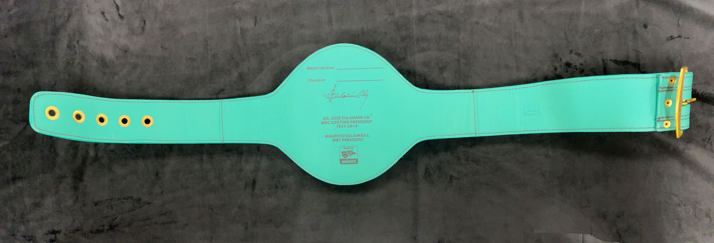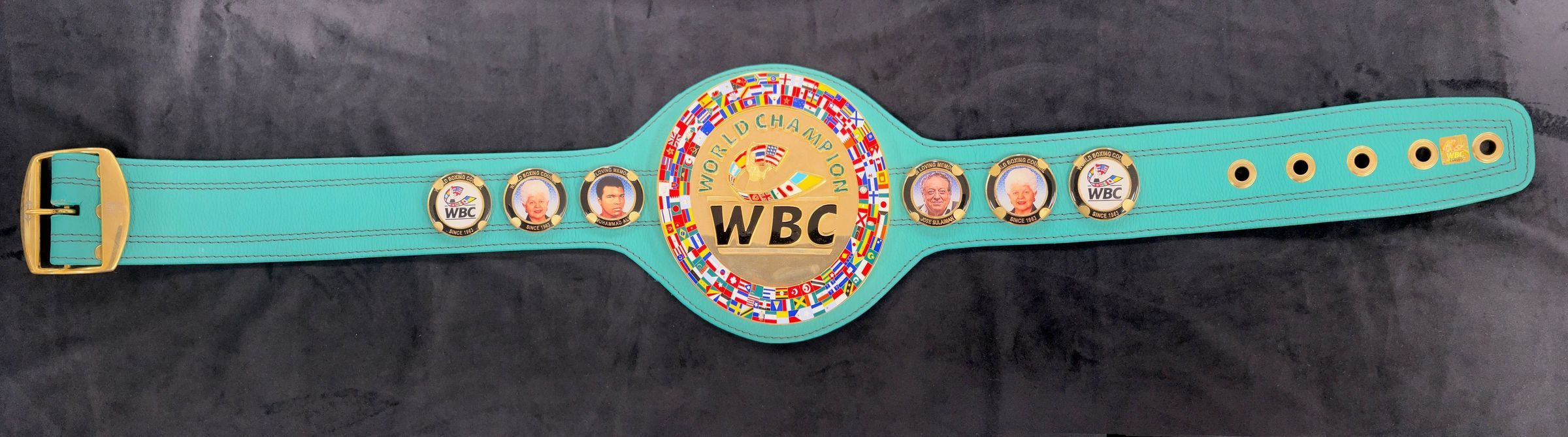 Wrestling championship belt with gold WBC logo and photos of Grace Napolitano, Muhammad Ali, and Jose Sulaiman. Back of the belt reads "Weight division, Champion, signature, Dr. Jose Sulaiman CH, WBC Lifetimes President, 1931-2014, Mauricio Sulaiman S., WBC President."Collection
