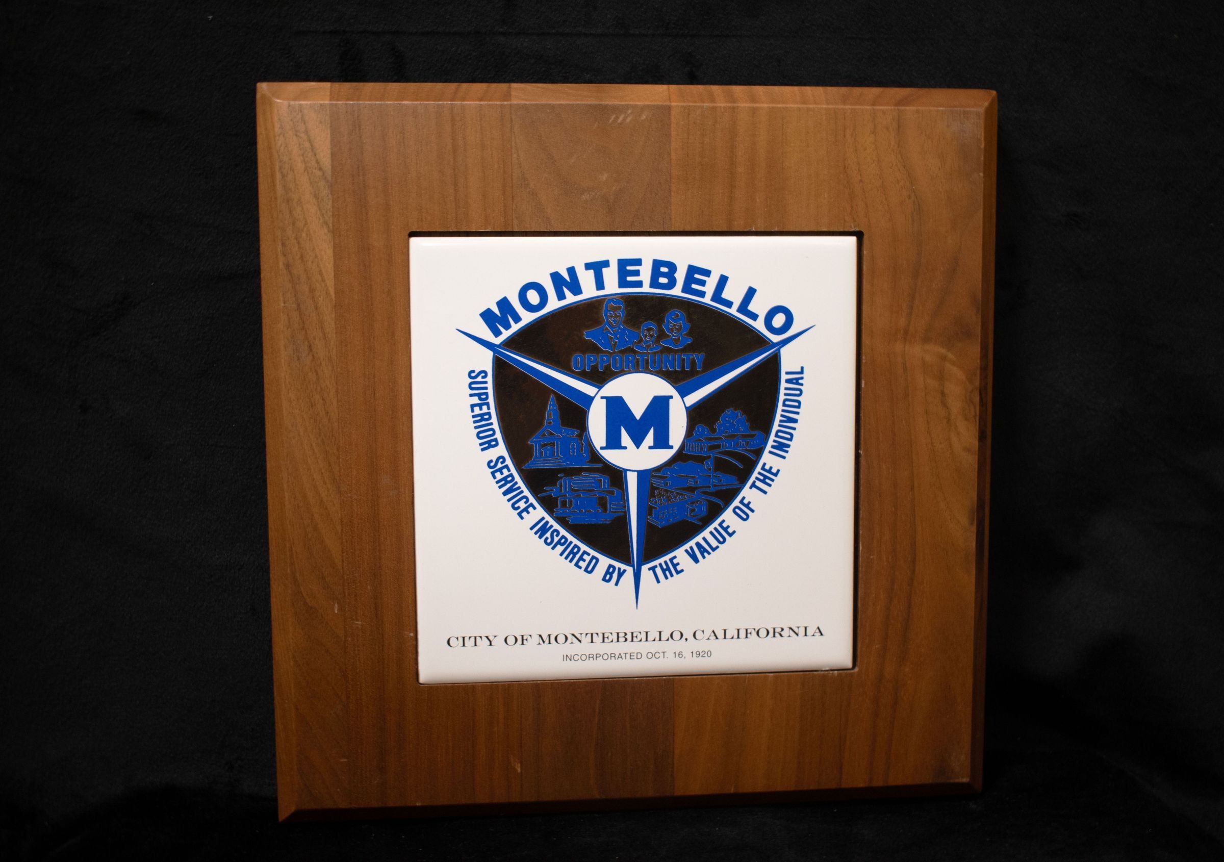Tile mounted inside a wooden plaque from the City of Montebello.Collection