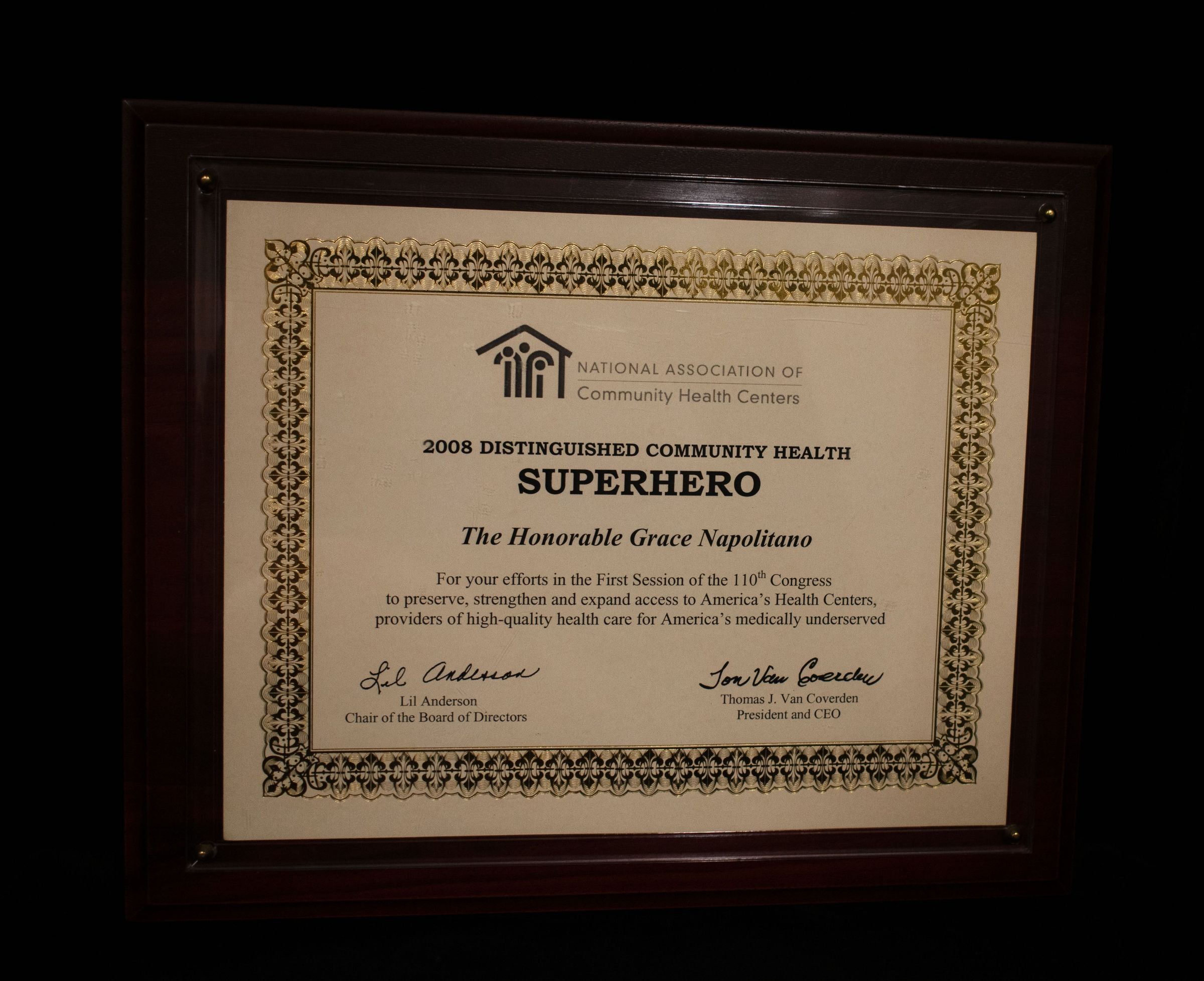 Wooden plaque from the National Association of Community Health Centers reading "2008 Distinguished Community Health Superhero, The Honorable Grace Napolitano, For your efforts in the First Session of the 110th Congress to preserve, strengthen and expand access to America's Health Centers, providers of high-quality health care for America's medically underserved."Collection