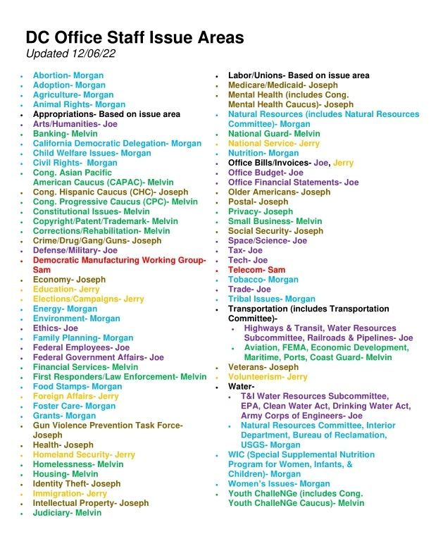 A color coded list of Grace Napolitano's DC staff issue areas of coverage.Subject Person/Organization