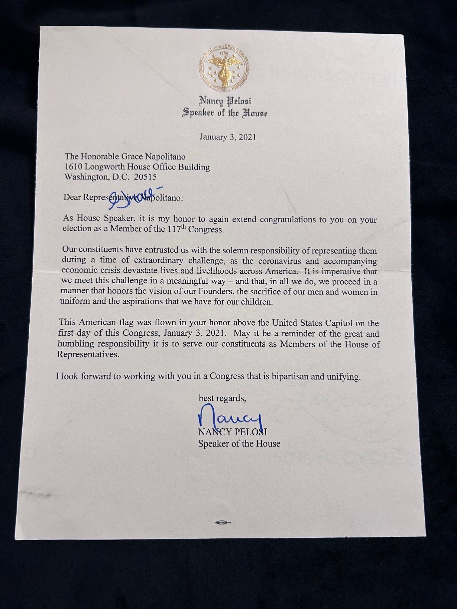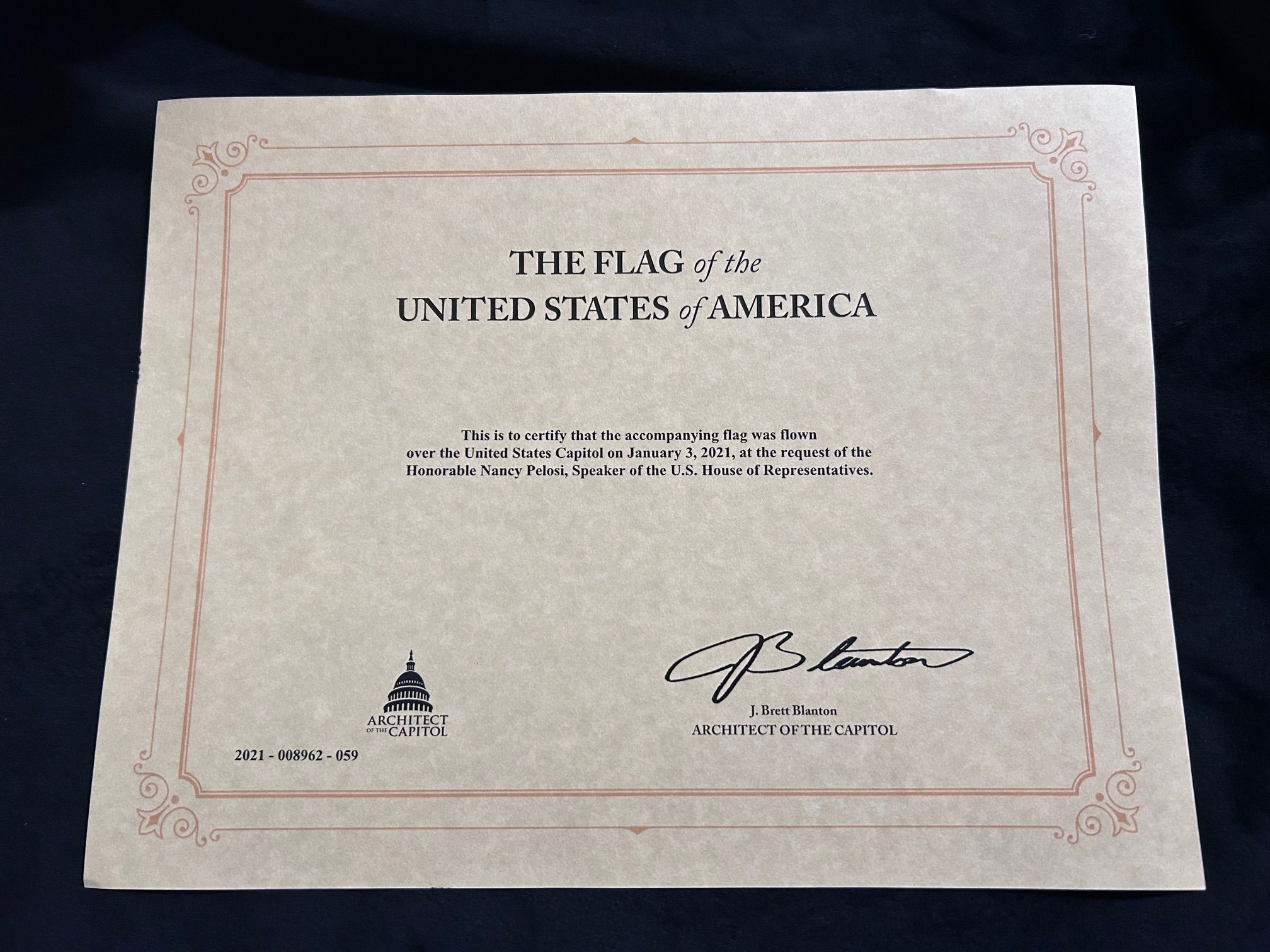 American flag flown over the Capitol Building with certificate from the Architect of the Capitol and letter from Nancy Pelosi.Collection