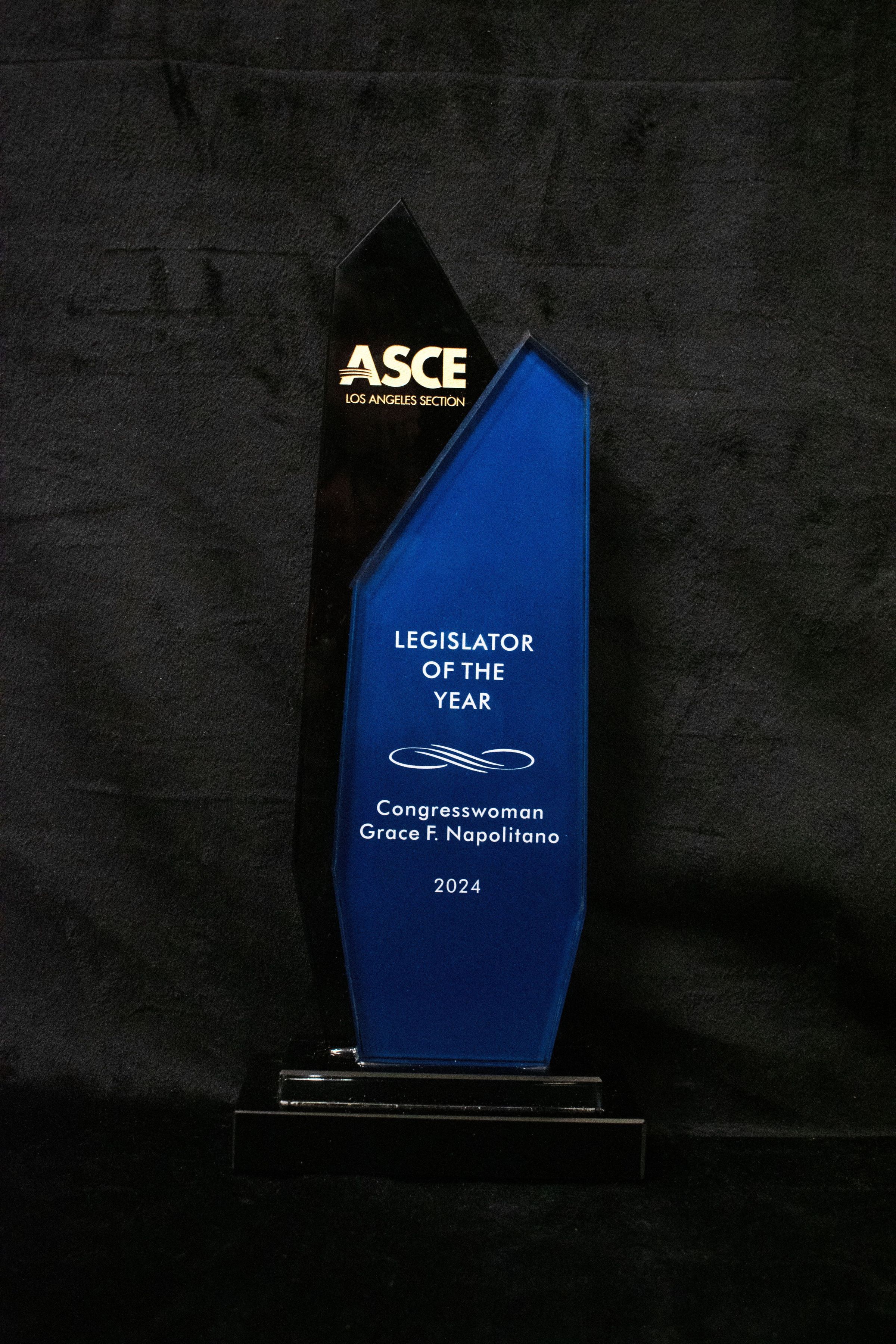 Glass award statue from the American Society of Civil Engineers (ASCE) Los Angeles Section reading "Legislator of the Year, Congresswoman Grace F. Napolitano, 2024."Collection