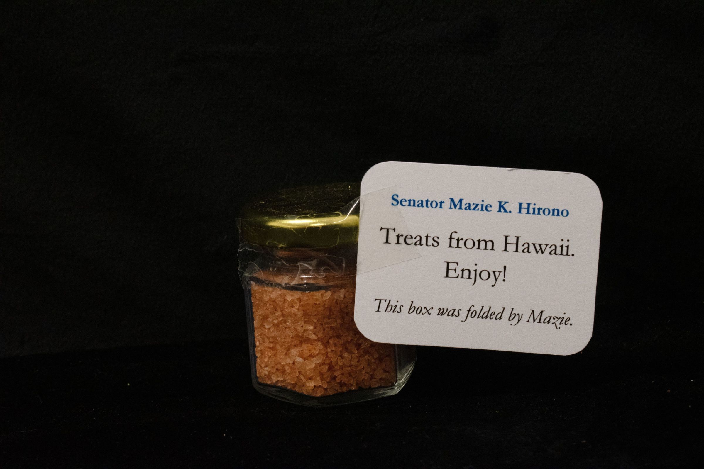 Glass jar filled with salt with a label reading "Senator Mazie K. Hirono, Treats from Hawaii. Enjoy! This box was folded by Mazie."Collection