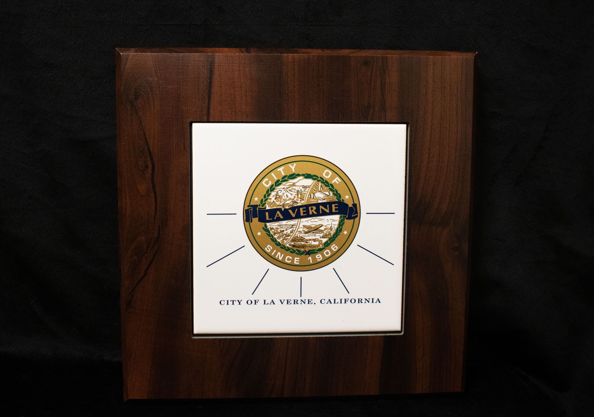 Tile mounted inside a wooden plaque from the City of La Verne.Collection