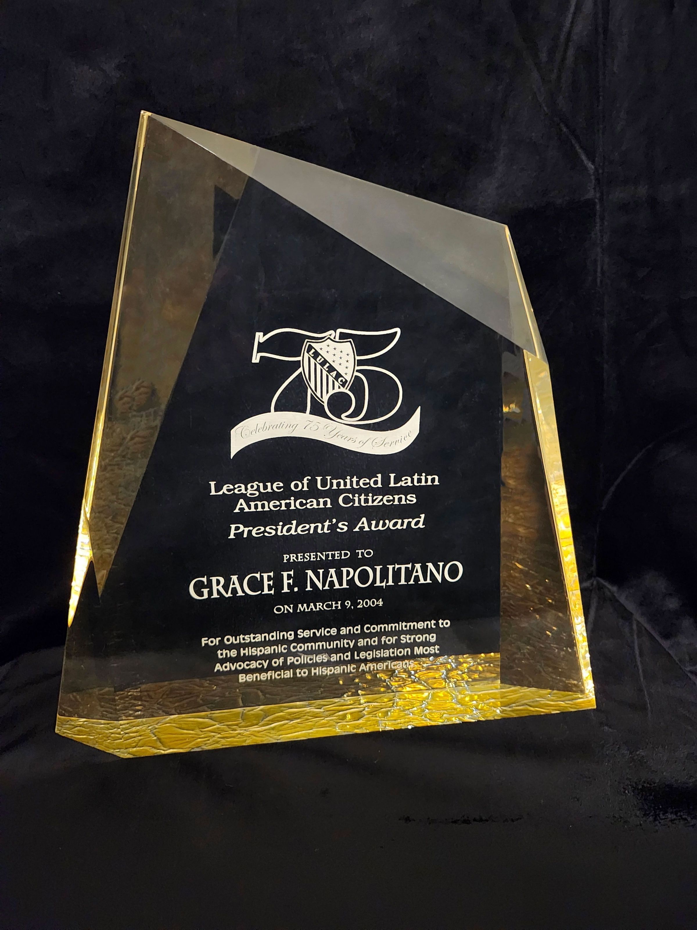 Plastic award statue from the League of United Latin American Citizens reading "President's Award, Presented to Grace F. Napolitano on March 9, 2004. For Outstanding Service and Commitment to the Hispanic Community and for Strong Advocacy of Policies and Legislation Most Beneficial to Hispanic Americans."Collection
