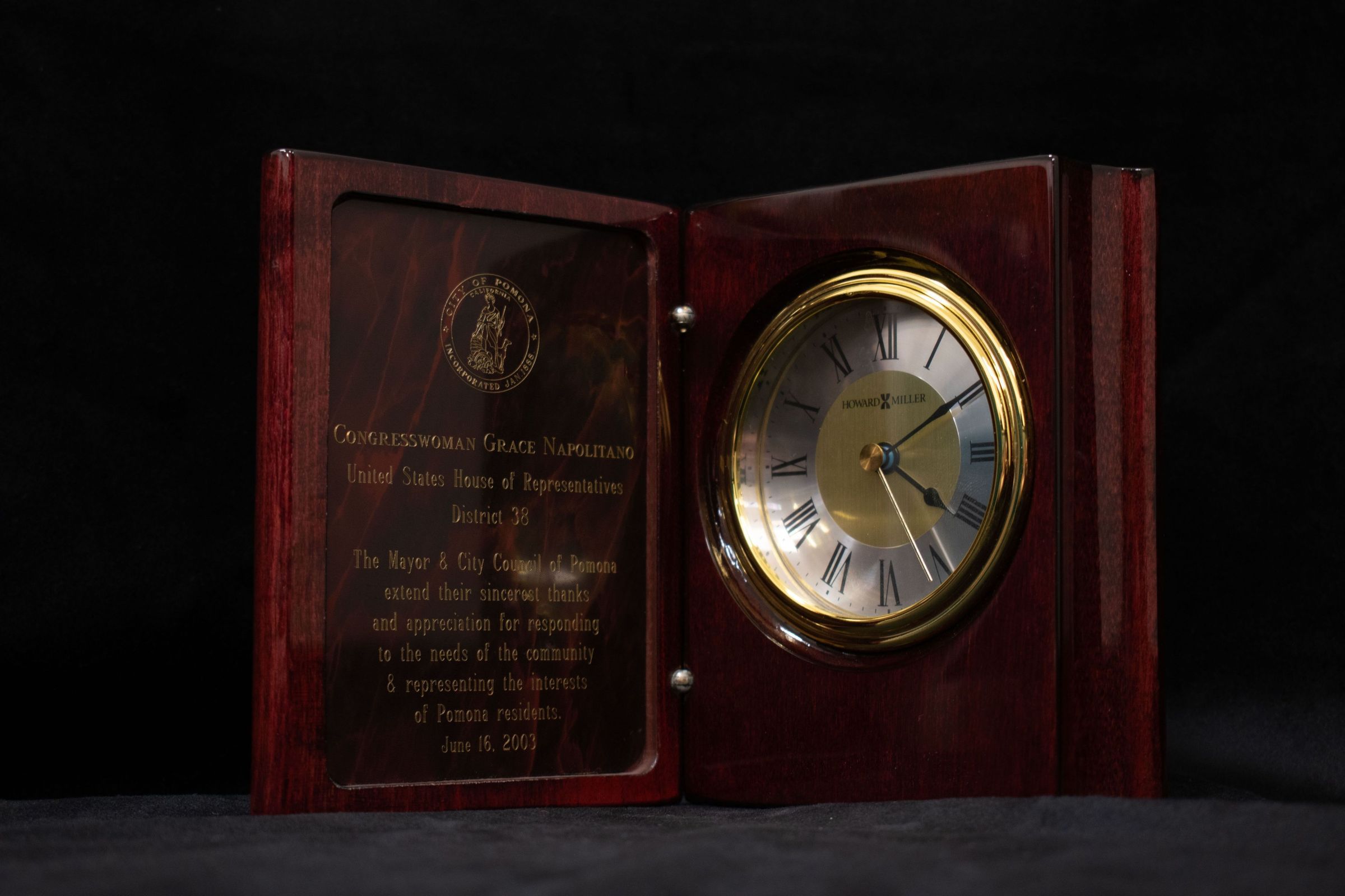 Clock mounted inside a wooden plaque from the City of Pomona reading "Congresswoman Grace Napolitano, United States House of Representatives, District 38, The Mayor & City Council extend their sincerest thanks and appreciation for responding to the needs of the community & representing the interests of Pomona residents, June 16, 2003."Collection