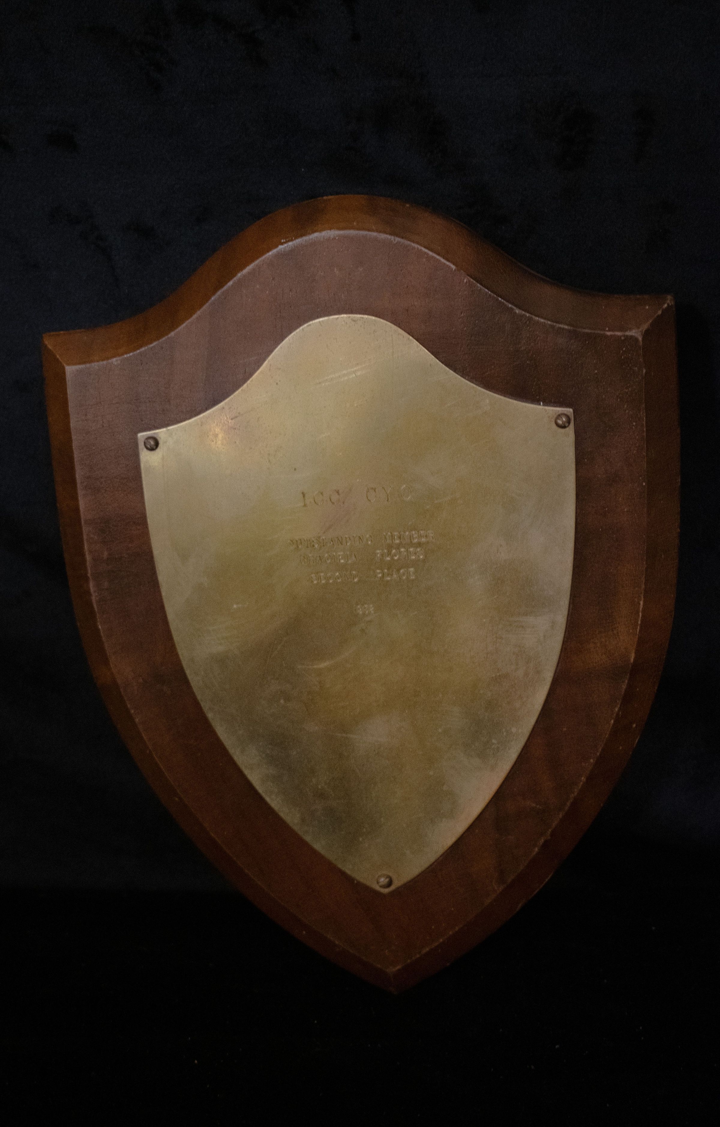 Wooden plaque from ICC/ CYC reading "Outstanding Member, Graciela Flores, Second Place, 1952."Collection