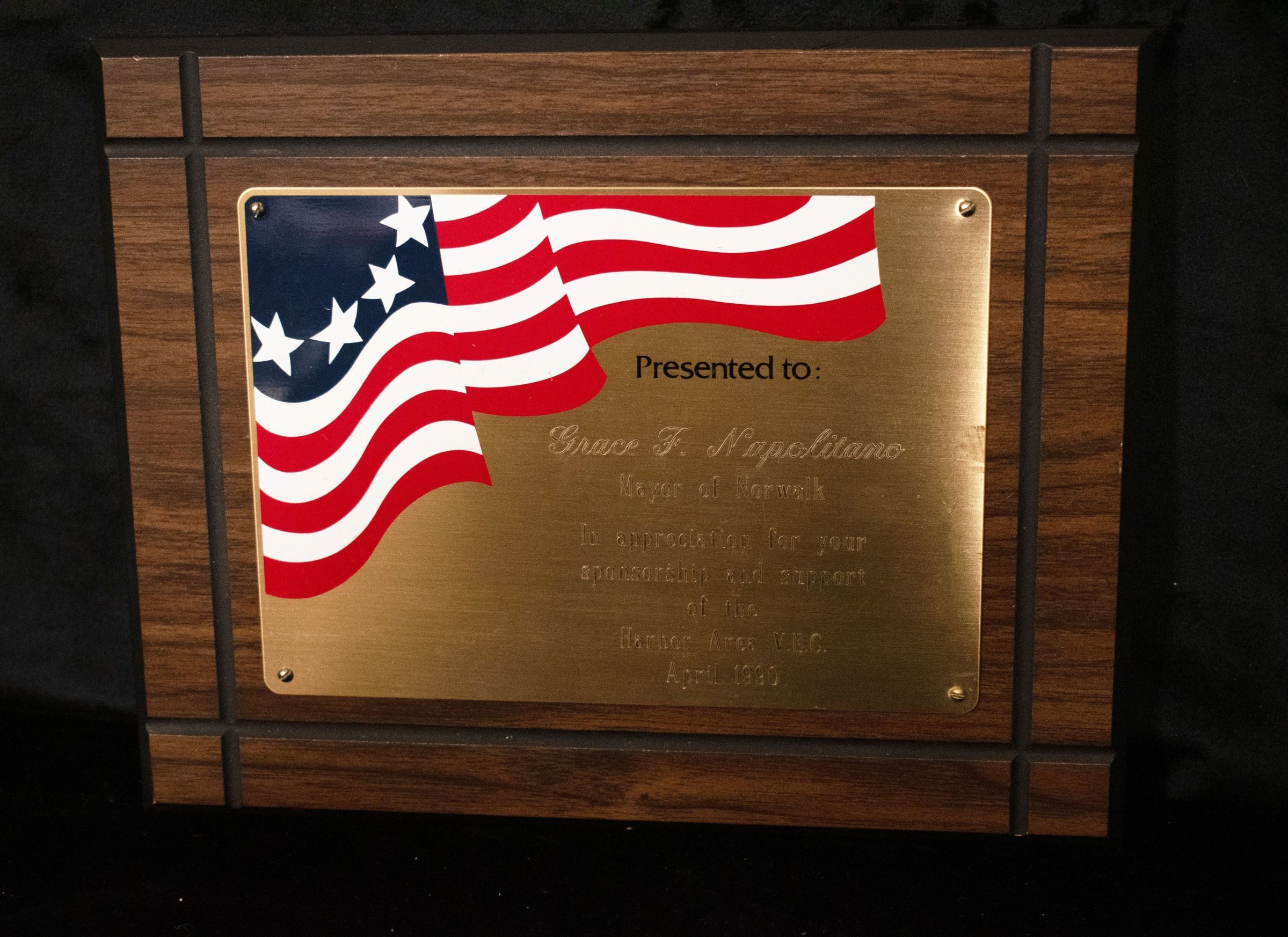 Wooden plaque from Harbor Area V.E.C. reading "Presented to: Grace F. Napolitano, Mayor of Norwalk, In appreciation for your sponsorship and support of the Harbor Area V.E.C, April 1990."Collection