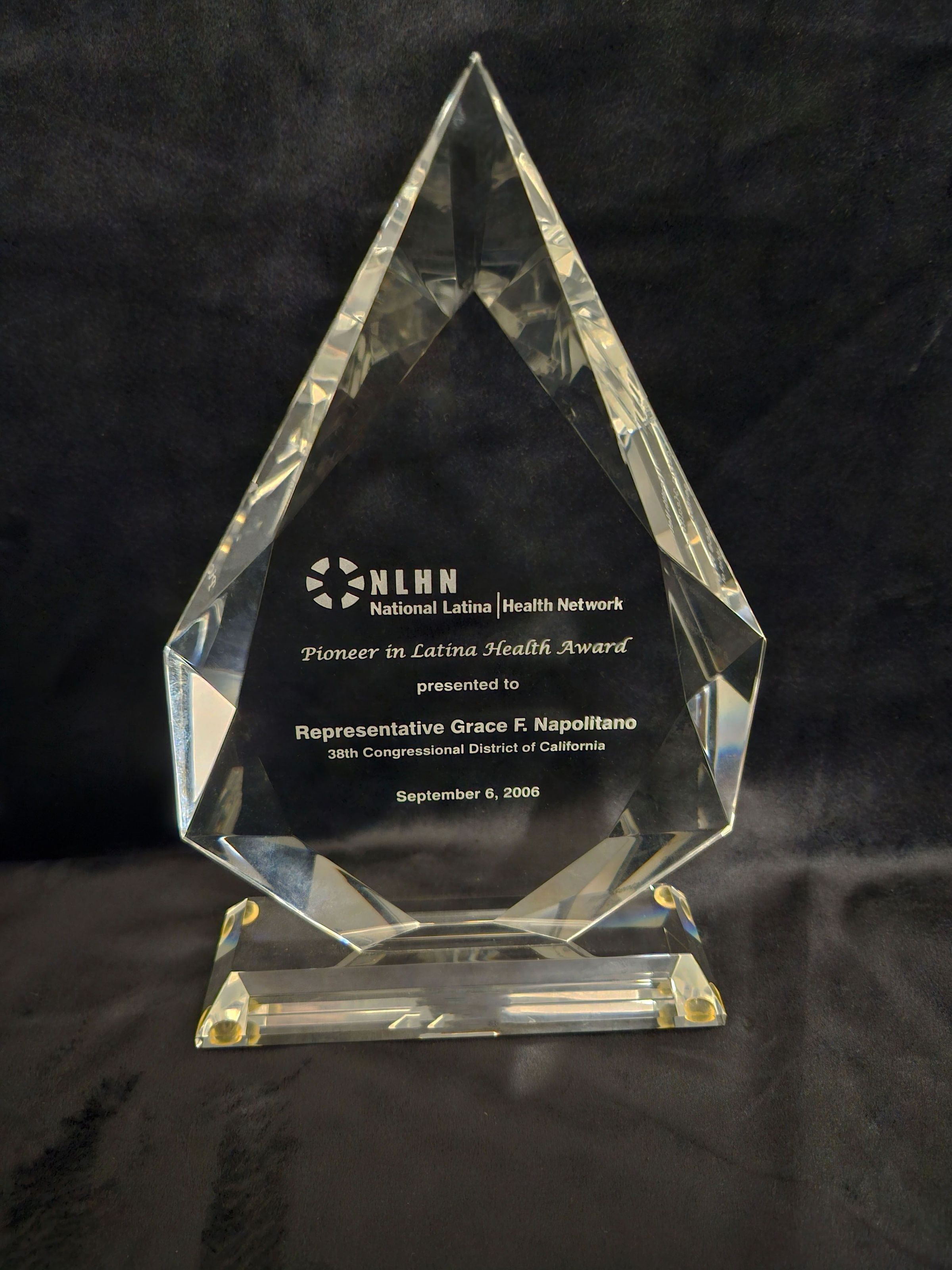 Glass award statue from the National Latina Health Network reading "Pioneer in Latina Health Award, presented to Representative Grace F. Napolitano, 38th Congressional District of California, September 6, 2006."Collection