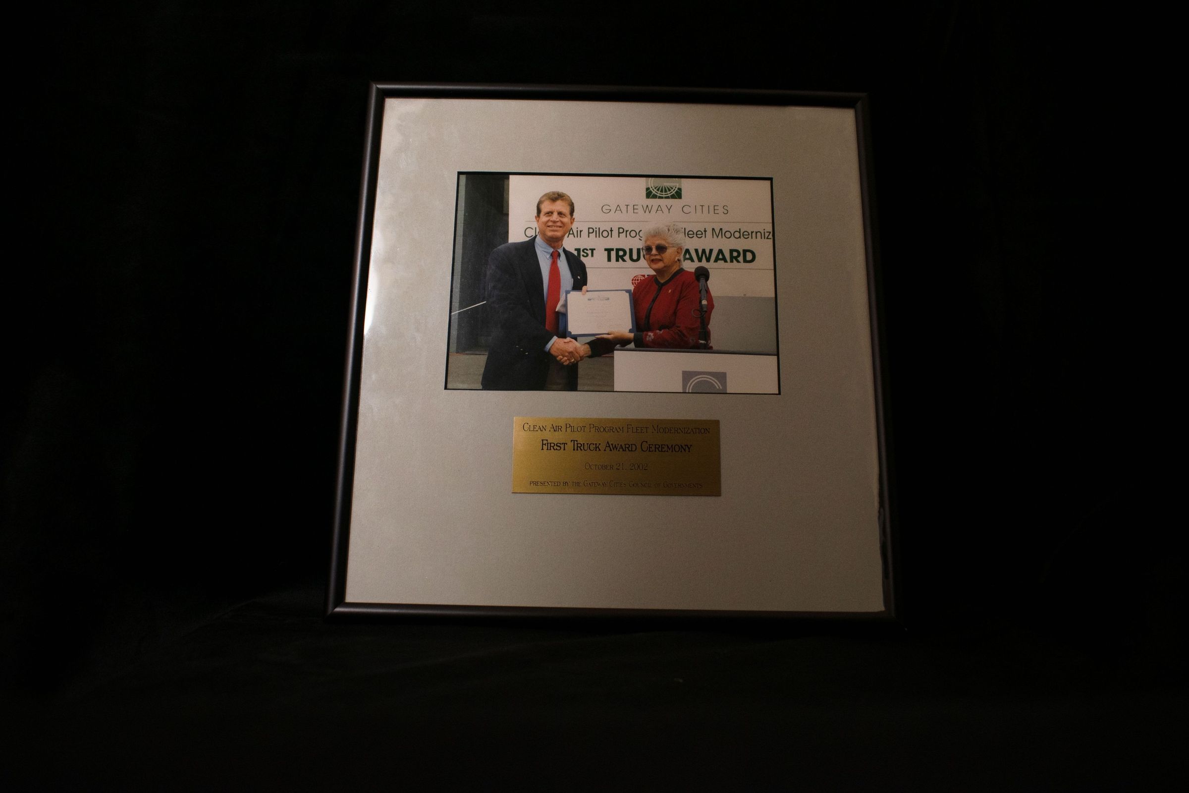 Framed photo with plaque from Gateway Cities Council of Governments reading "Clean Air Pilot Program Fleet Modernization, First Truck Award Ceremony, October 21, 2002, Presented by the Gateway Cities Council of Governments."Collection