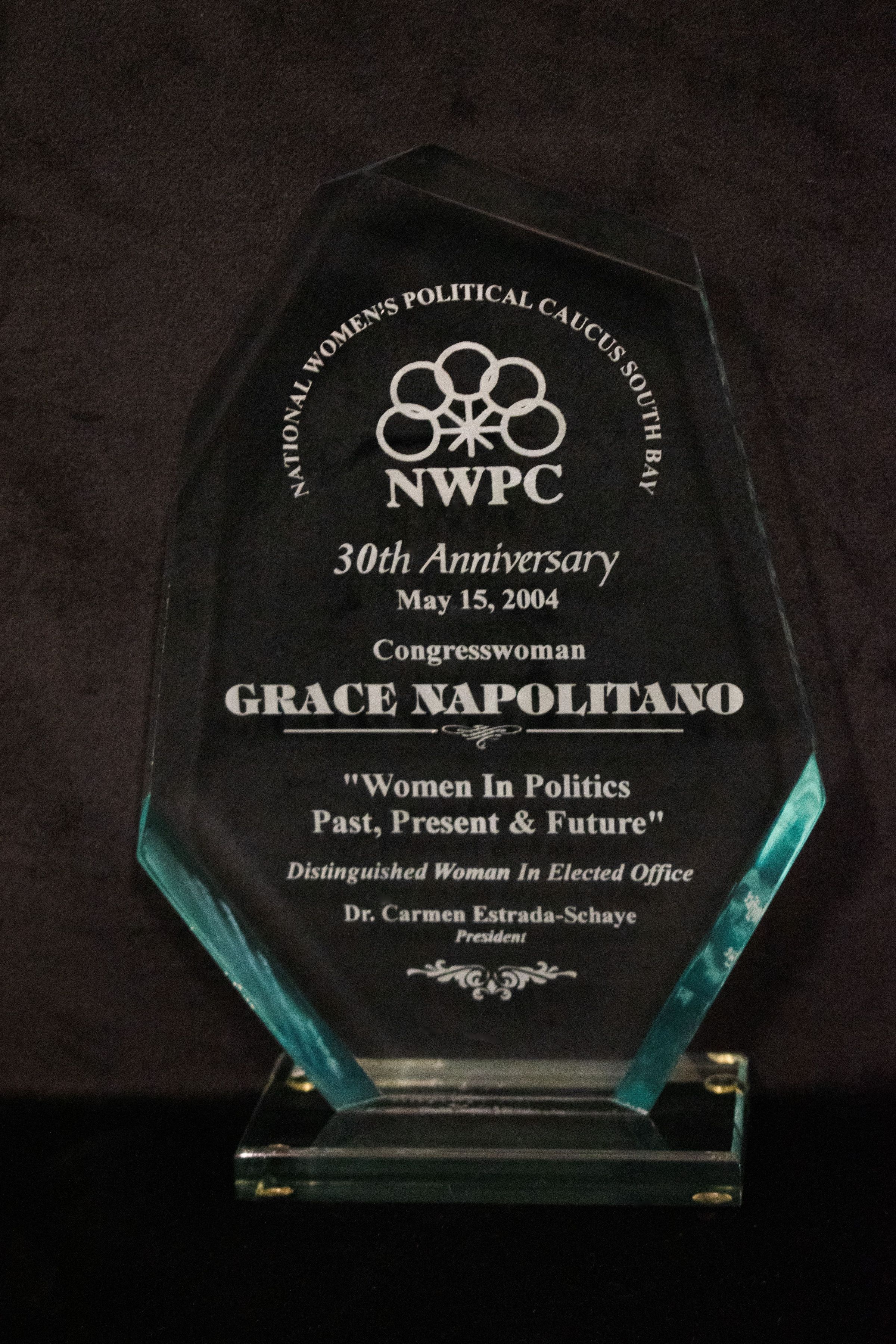 Plastic award statue from NWPC reading "30th Anniversary, May 15, 2004, Congresswoman Grace Napolitano, 'Women In Politics Past, Present & Future' Distinguished Woman In Elected Office, Dr. Carmen Estrada-Schaye, President."Collection