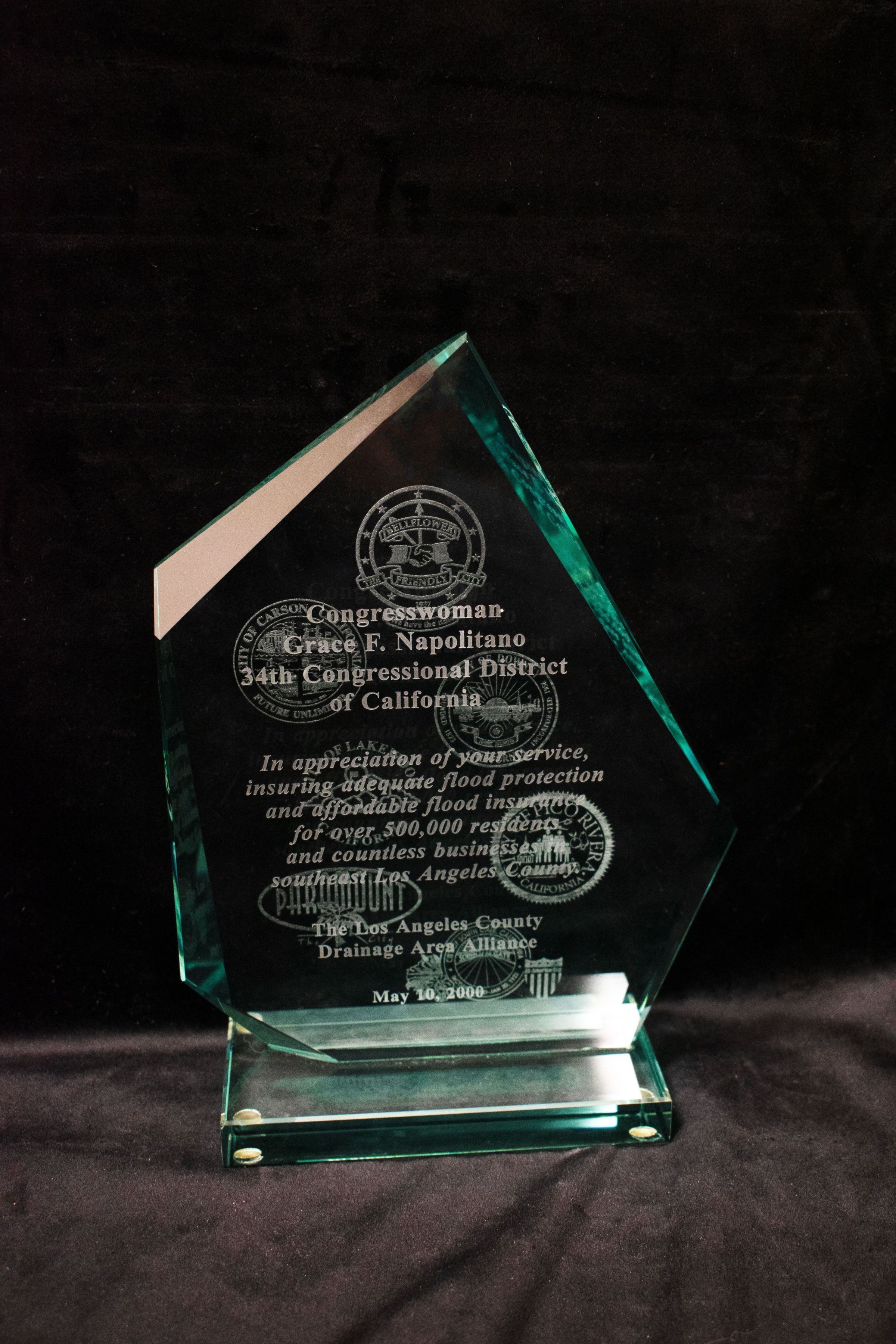 Glass award statue from the Los Angeles County Drainage Area Alliance reading "Congresswoman Grace F. Napolitano, 34th Congressional District of California, In appreciation of your service insuring adequate flood protection and affordable flood insurance for over 500,000 residents and countless businesses in southeast Los Angeles County. The Los Angeles County Drainage Area Alliance, May 10, 2000."Collection