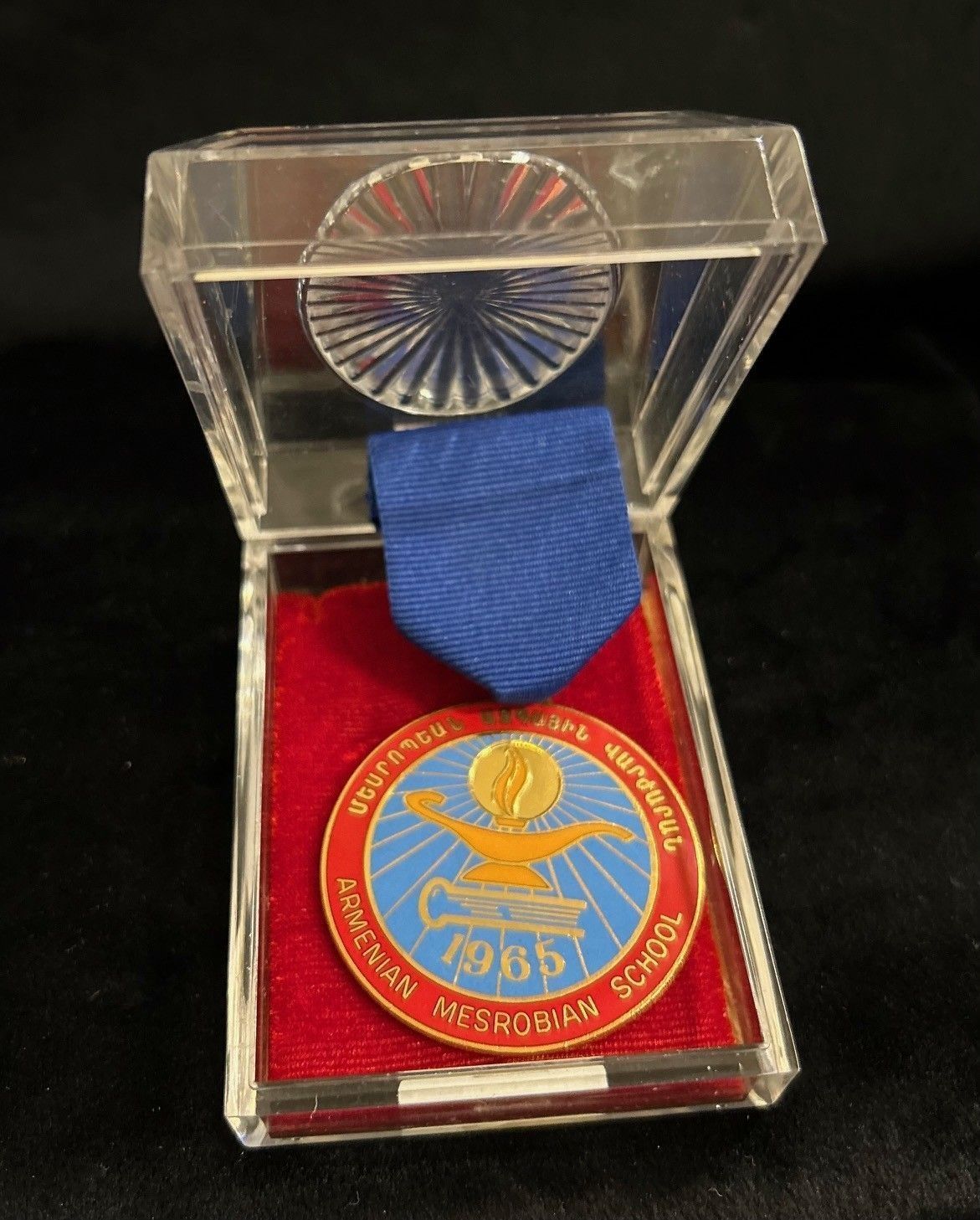 Medal on a ribbon pin reading "Armenian Mesrobian School, 1965."Collection