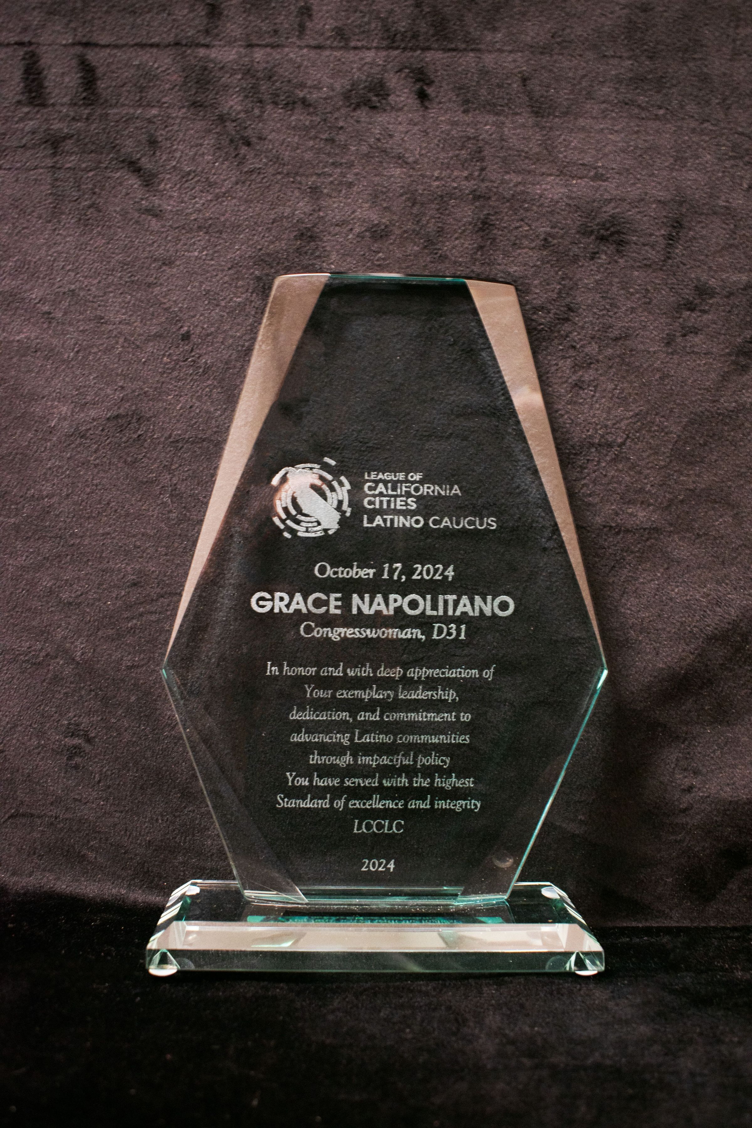 Glass award statue from the League of California Cities Latino Caucus reading "October 17, 2024, Grace Napolitano Congresswoman, D31, In honor and deep appreciation of Your exemplary leadership, dedication, and commitment to advancing Latino communities through impactful policy You have served with the highest Standard of excellence and integrity, LCCLC, 2024."Collection