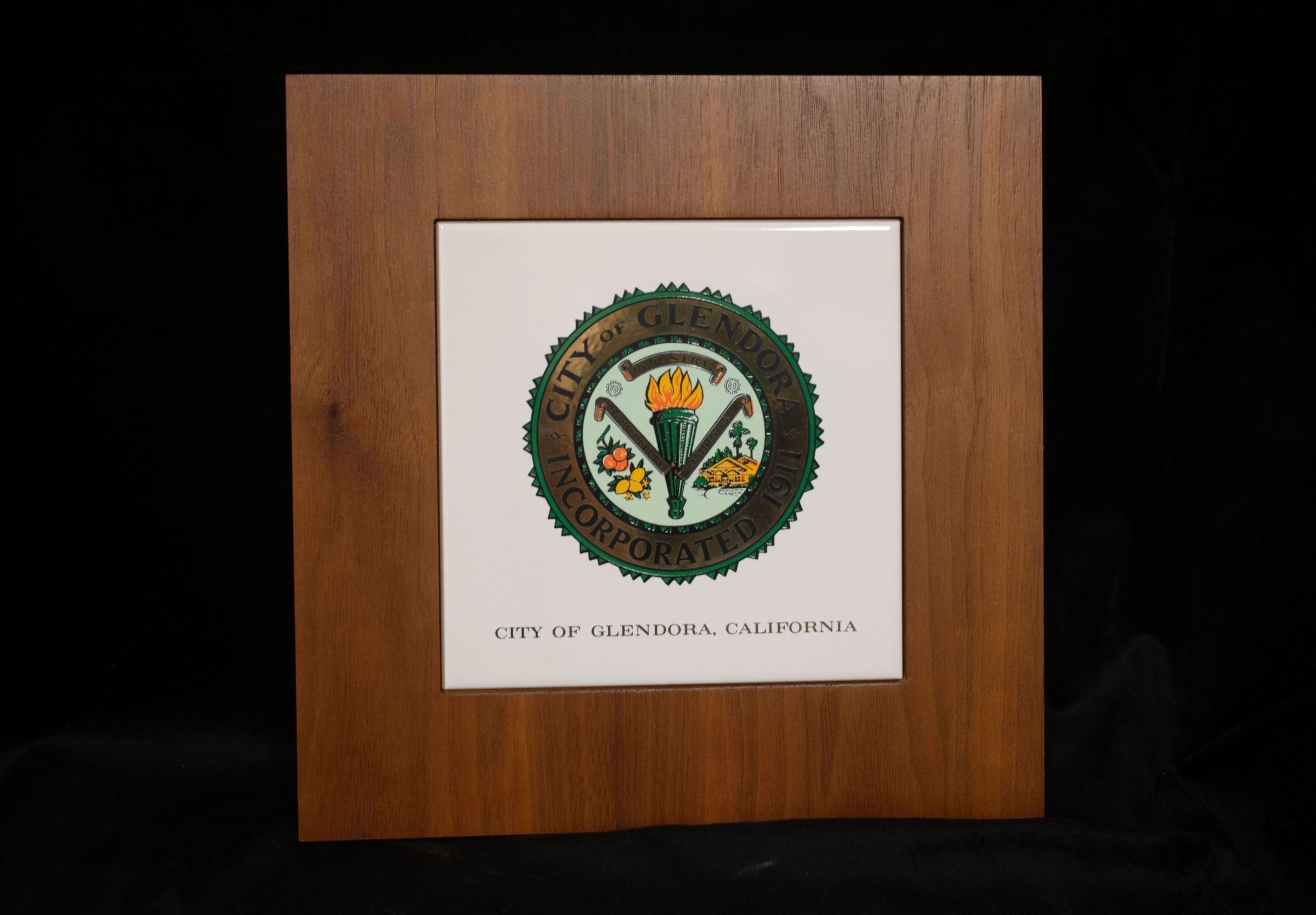 Tile mounted inside a wooden plaque from the city of Glendora, California.Collection
