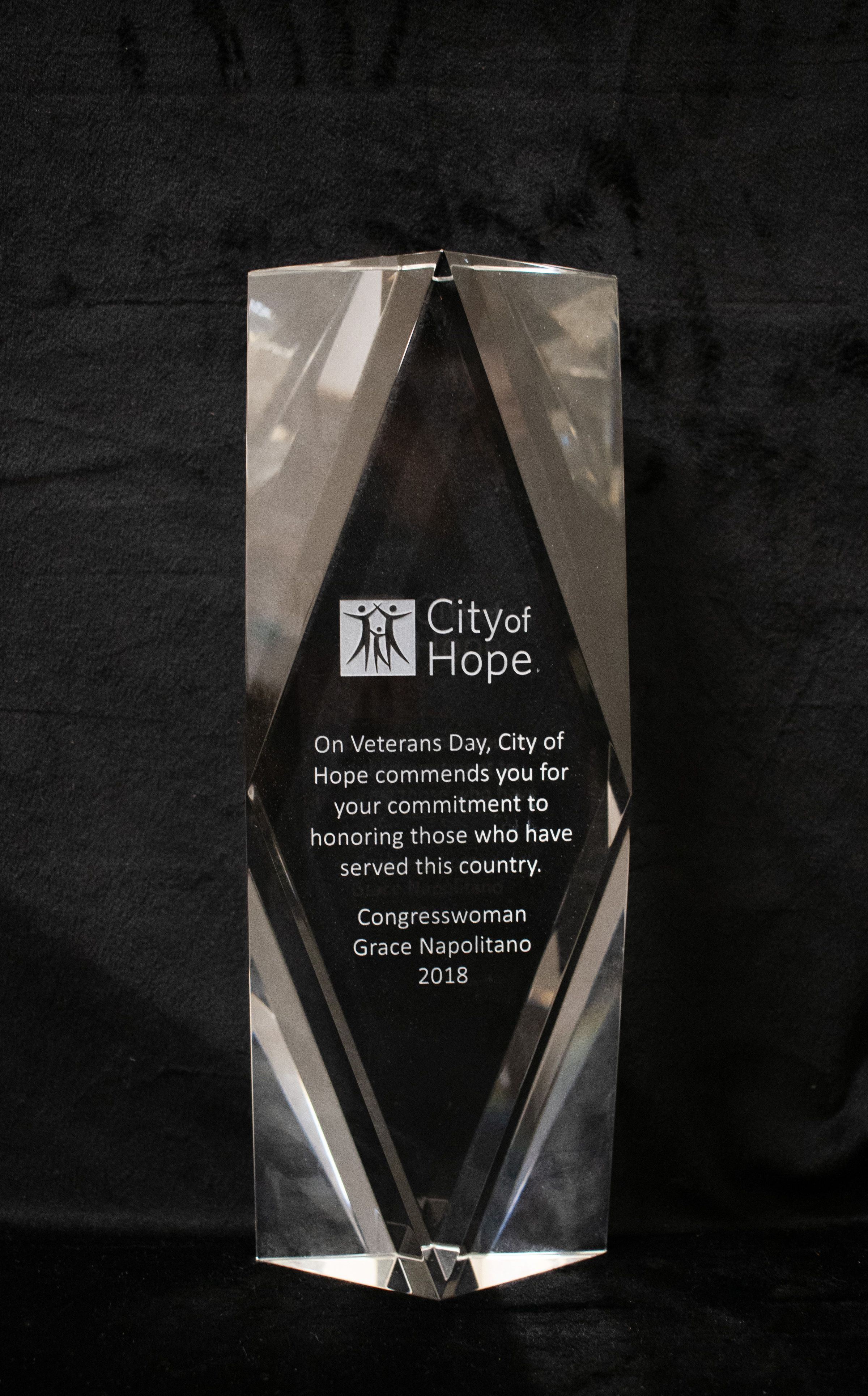 Glass award statue from City of Hope reading "On Veterans Day, City of Hope commends you for your commitment to honoring those who have served this country. Congresswoman Grace Napolitano, 2018."Collection