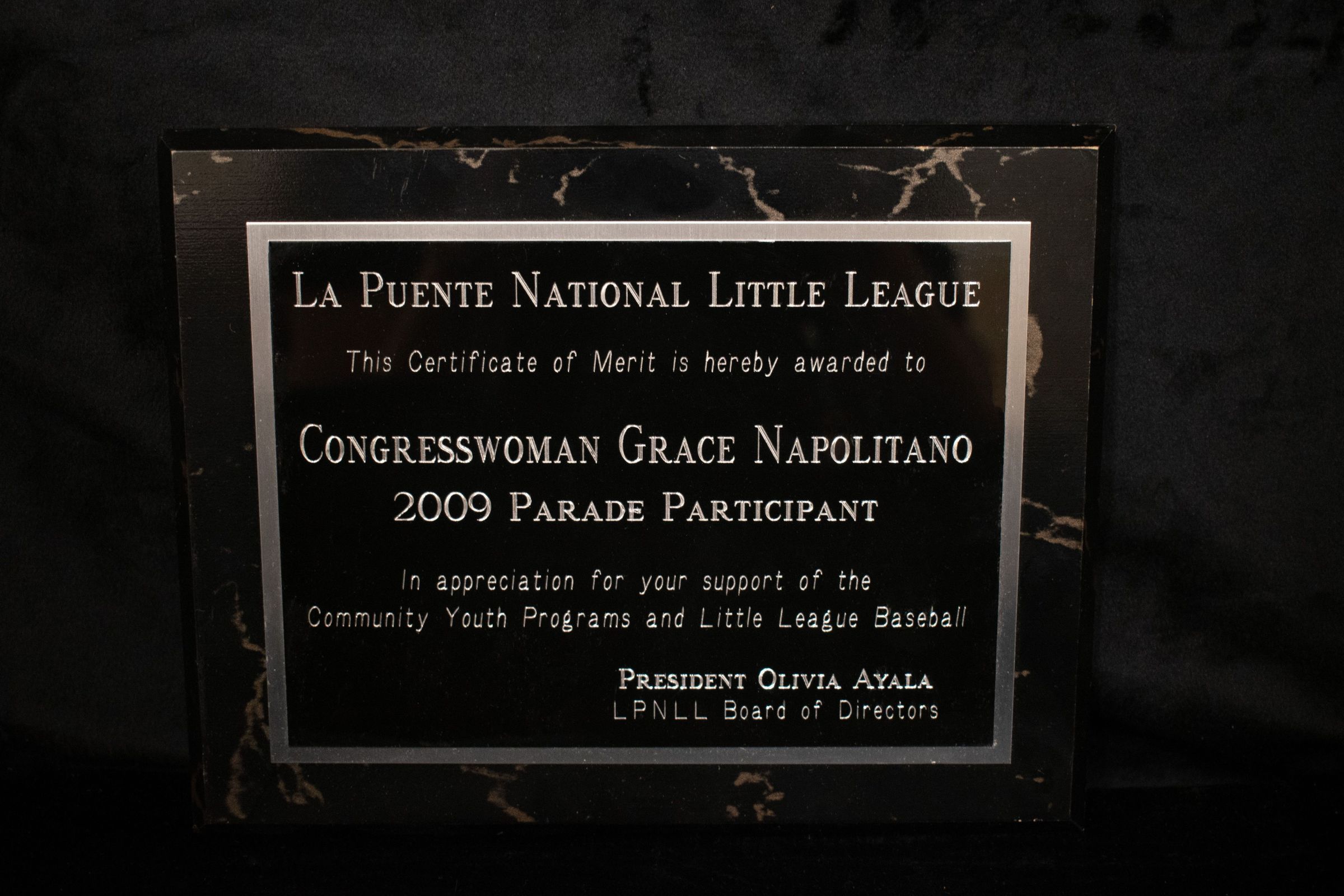 Wooden plaque from La Puente National Little League reading "The Certificate of Merit is hereby awarded to Congresswoman Grace Napolitano, 2009 Parade Participant, In appreciation for your support of the Community Youth Programs and Little League Baseball."Collection