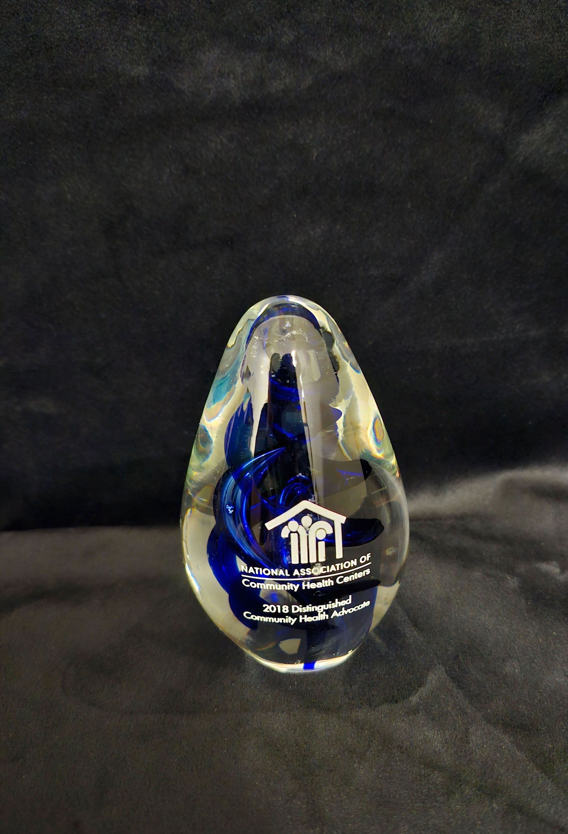 Glass award statue from the National Association of Community Health Centers reading "2018 Distinguished Community Health Advocate."Collection