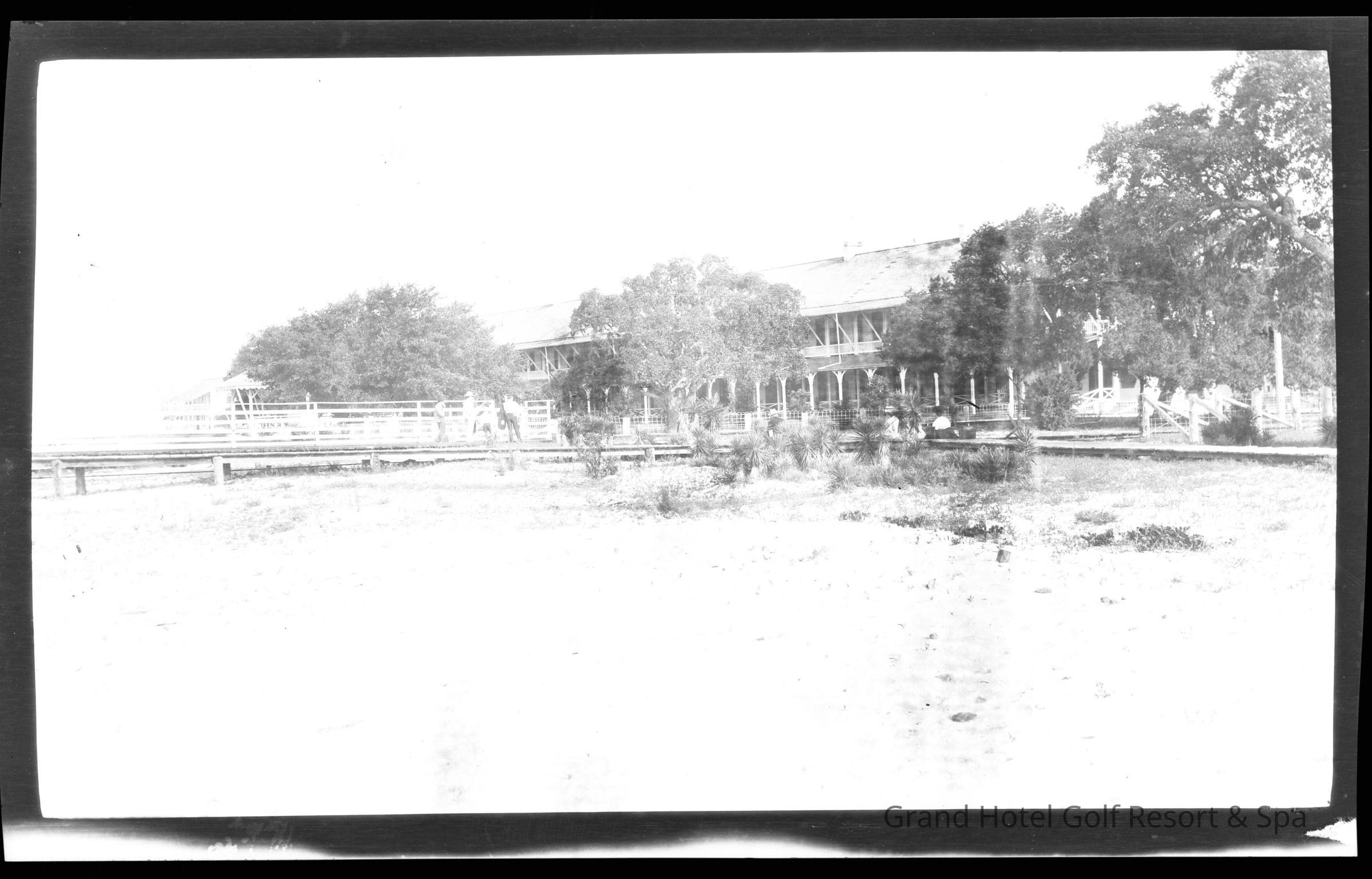 Photo of Grand Hotel II as seen from south beachside. Note the people on wooden walkway.. Image shared by the descendants of Major James K. Glennon, who purchased the Grand Hotel in 1901. The guest rooms were accessible from the shaded balconies. Some descriptions of the sandy waterfront include the presence of sand spurs! Note the live oaks are not particularly large, due to the close proximity to the great "point" and waterfront on Mobile Bay.Create Date