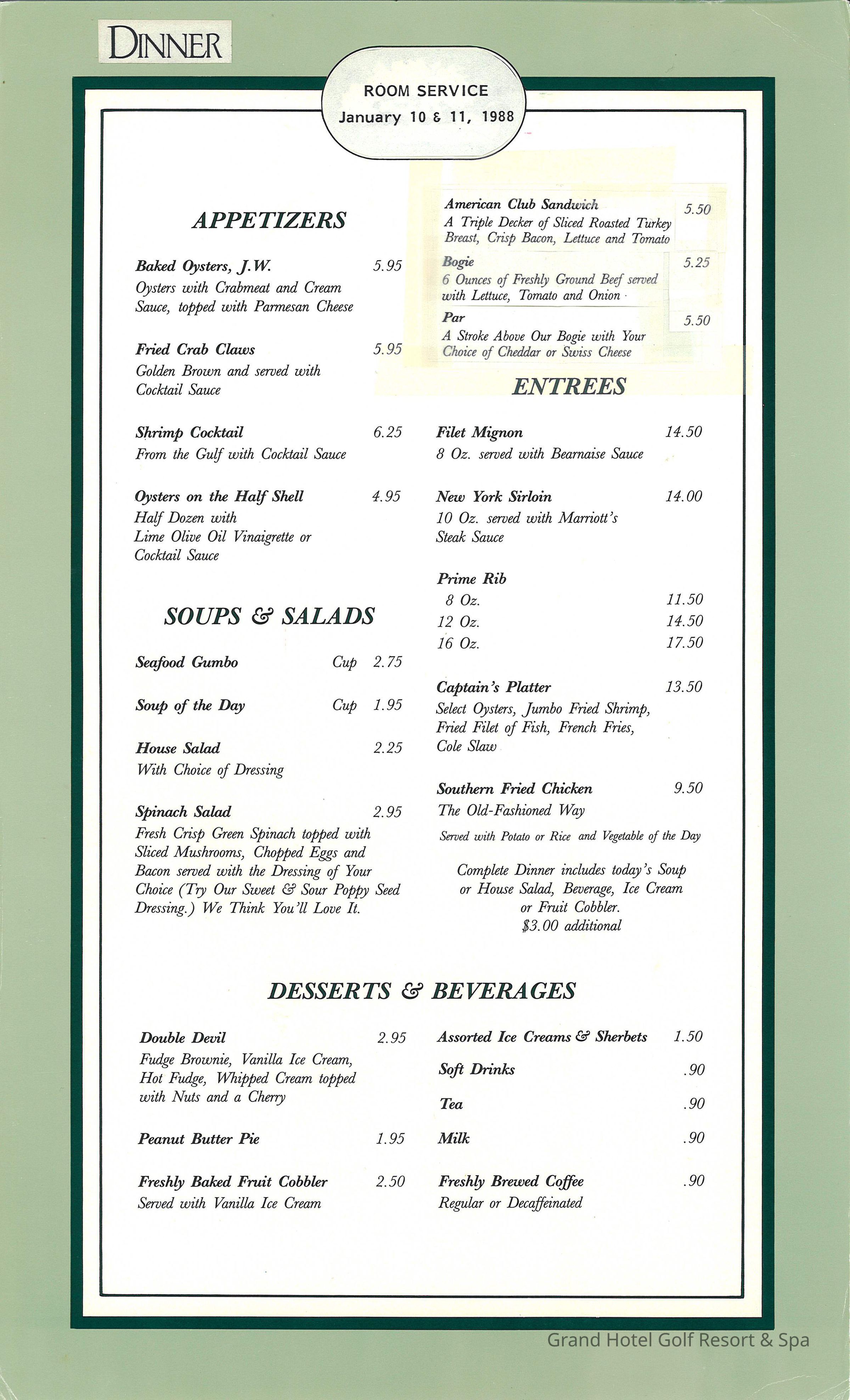 Lakewood Golf Room Service Menu