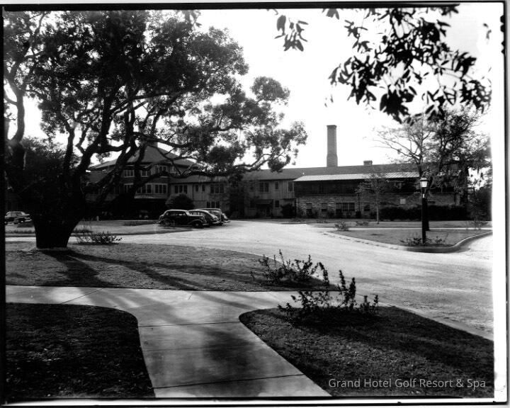 B&W photo Grand Hotel early 1940's. Main drive and entrance to Main Building; live oak in foreground.Create Date