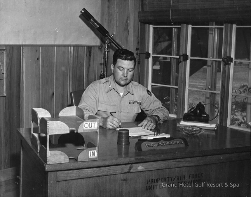 Lt. Col. Matthew Thompson was the commander of Operation Ivory Soap in 1944-1945. He is seated at his desk in the East Wing of Grand Hotel, now known as the Thompson Suite. Circa July 1944Description