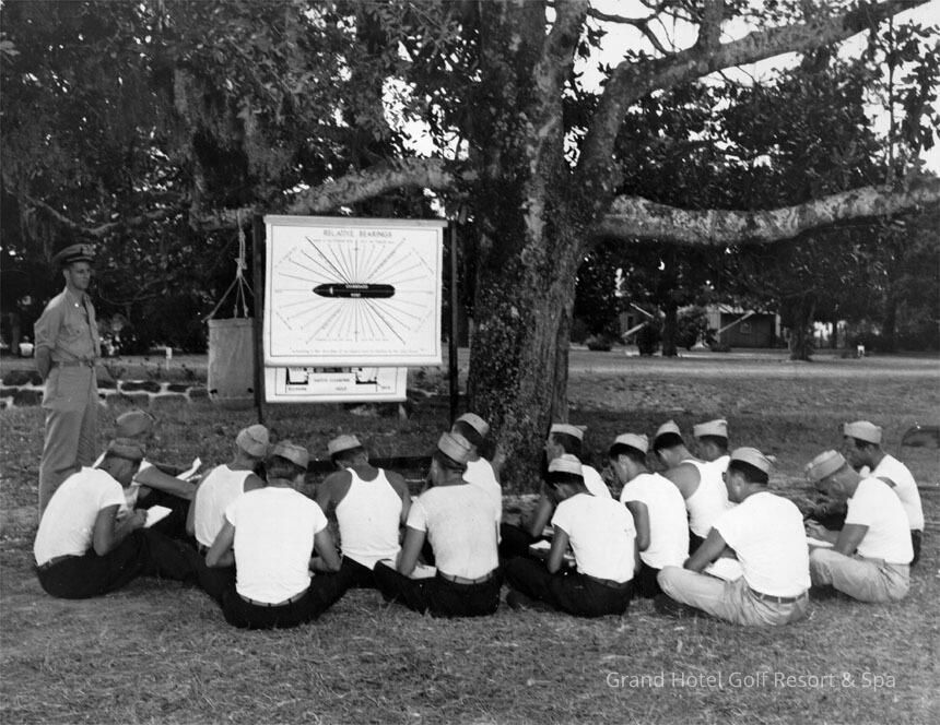 The almost new Grand Hotel III was leased to the Government for military training in 1944-1945, long before there was conference meeting space. Classes were conducted in the shade of the oaks or under the pavilion at Julep Point, where seaman training was conducted. Once training was completed, these Army Air Corps aircraft repairmen or machinists boarded modified Liberty Ships for a journey to the Pacific, where they repaired B-29's ad P-51's in the fight against Japan.Create Date