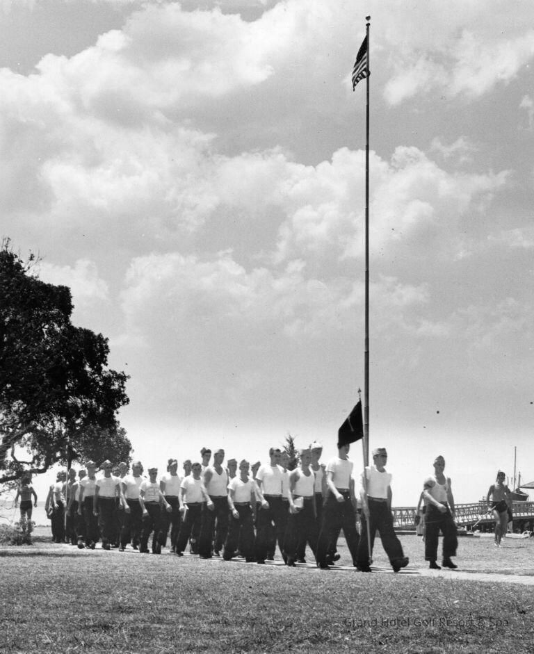WWII Operation Ivory Soap - marching drill at Grand Hotel, adjacent to the hotel's fishing pier.Description