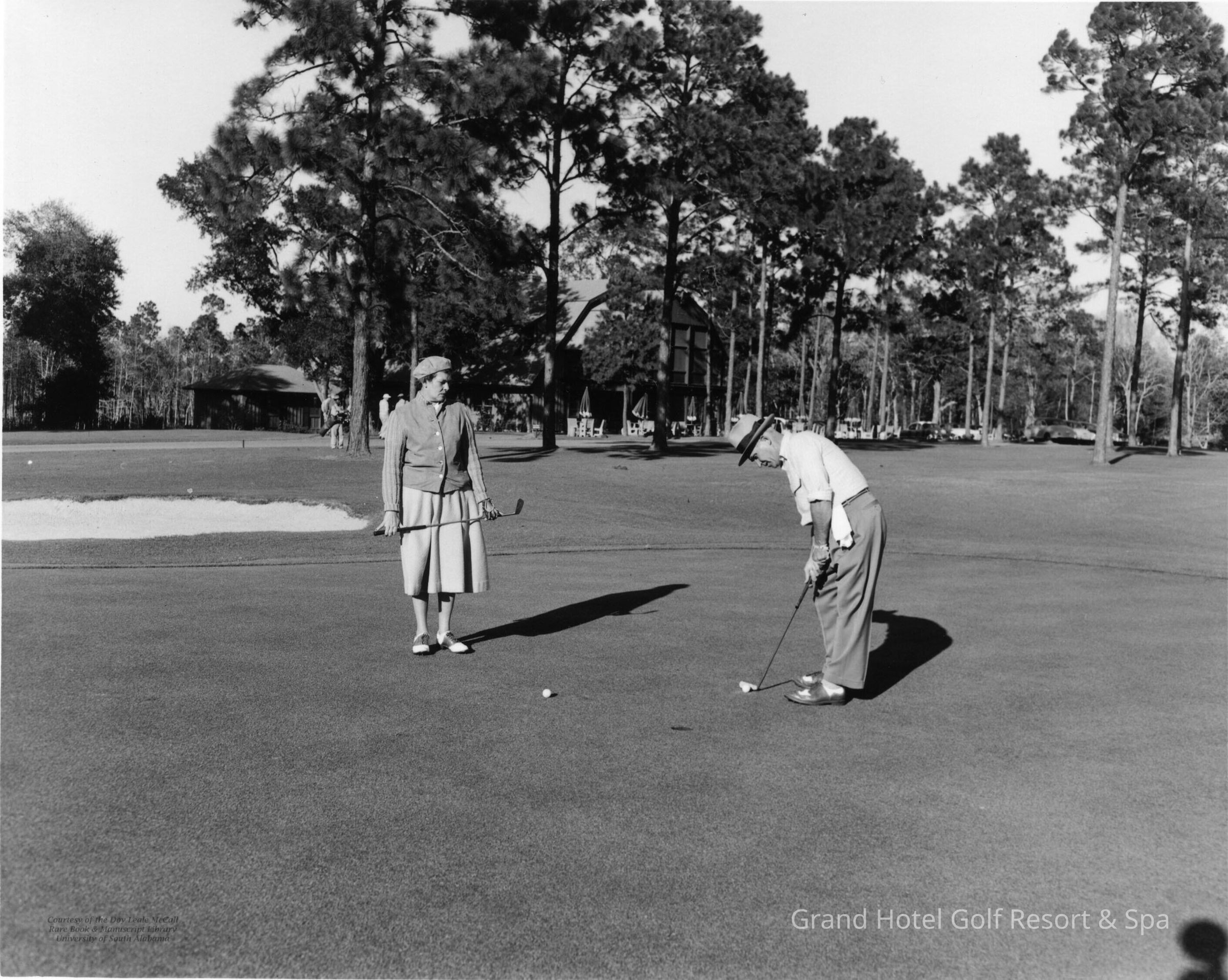Golfing at Lakewood Golf Club in the late 1940's - clubhouse is nestled in the pines.Description