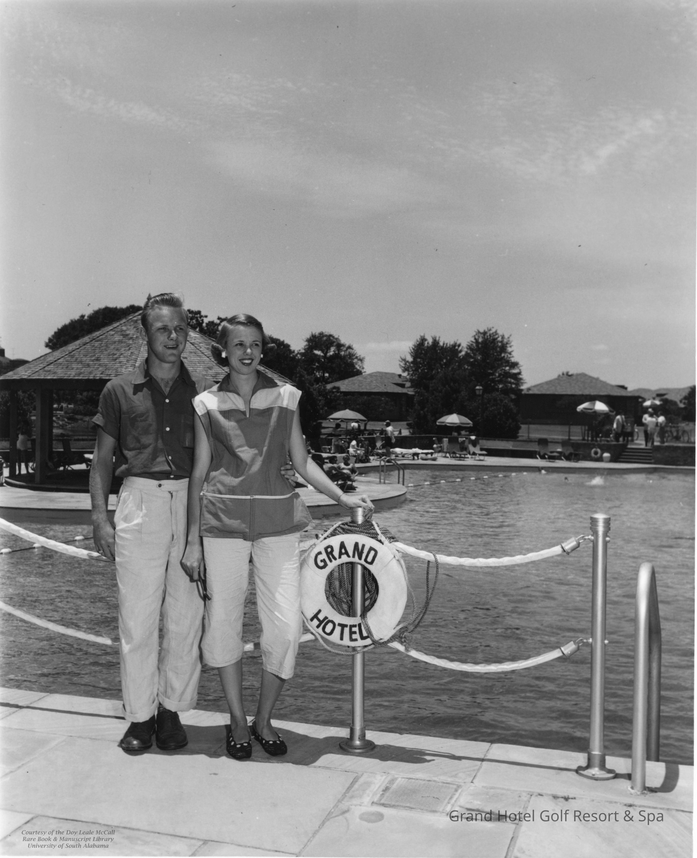 The Grand Hotel is always busiest in the summer ... this couple is enjoying the poolside activities at Point Clear. The Grand Pool, adjacent to the marina, was known as having the largest pool in the South for many years. The "old pool" was removed in 1999 to make way for the Spa Building, which opened in June of 2002. A new Grand Feature Pool complex opened in July of 2001, located where the cottages once stood.Create Date