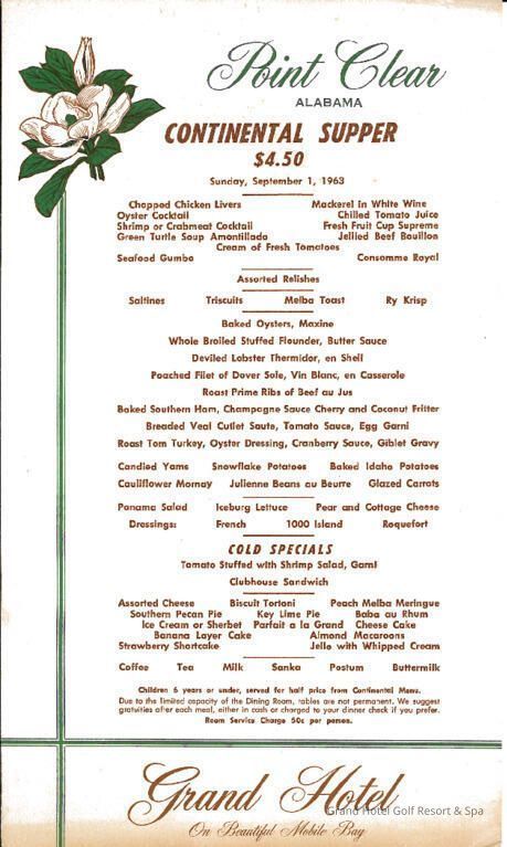 1963 Grand Hotel Sunday Supper menu