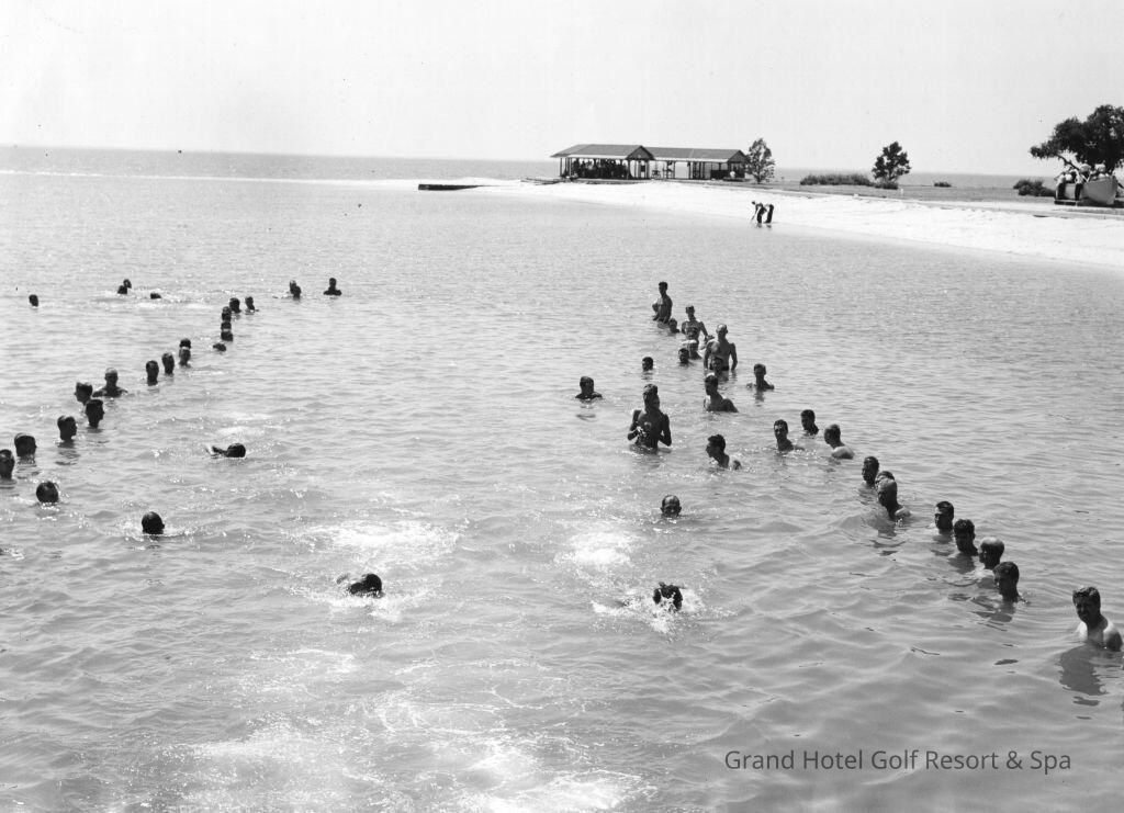 Swimming anyone? Part of the marine training of Army Air Corps soldiers was swimming lessons; these soldiers who knew how to repair aircraft now had to learn how to be part of the crew onboard an Aircraft Repair Unit-F (floating). These soldiers are in Mobile Bay adjacent to the Grand Hotel in Point Clear, AL.Create Date