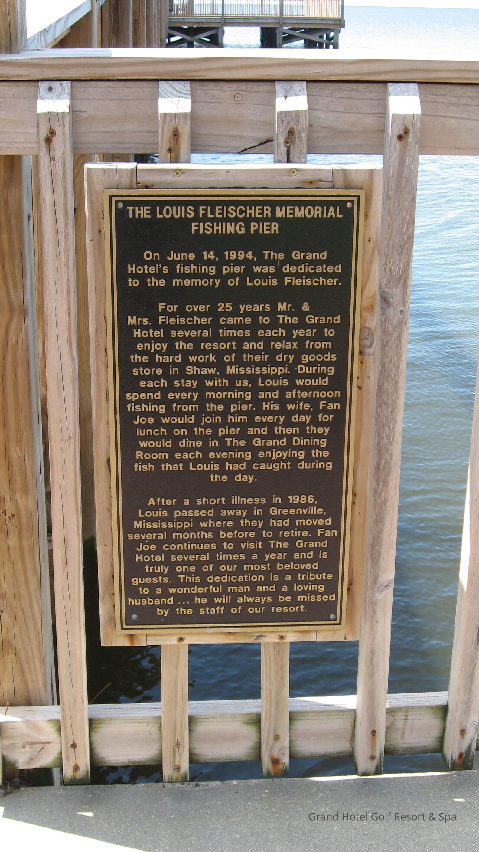 Verbiage on the plaque: "On June 14, 1994, the Grand Hotel's fishing pier was dedicated to the memory of Louis Fleischer.