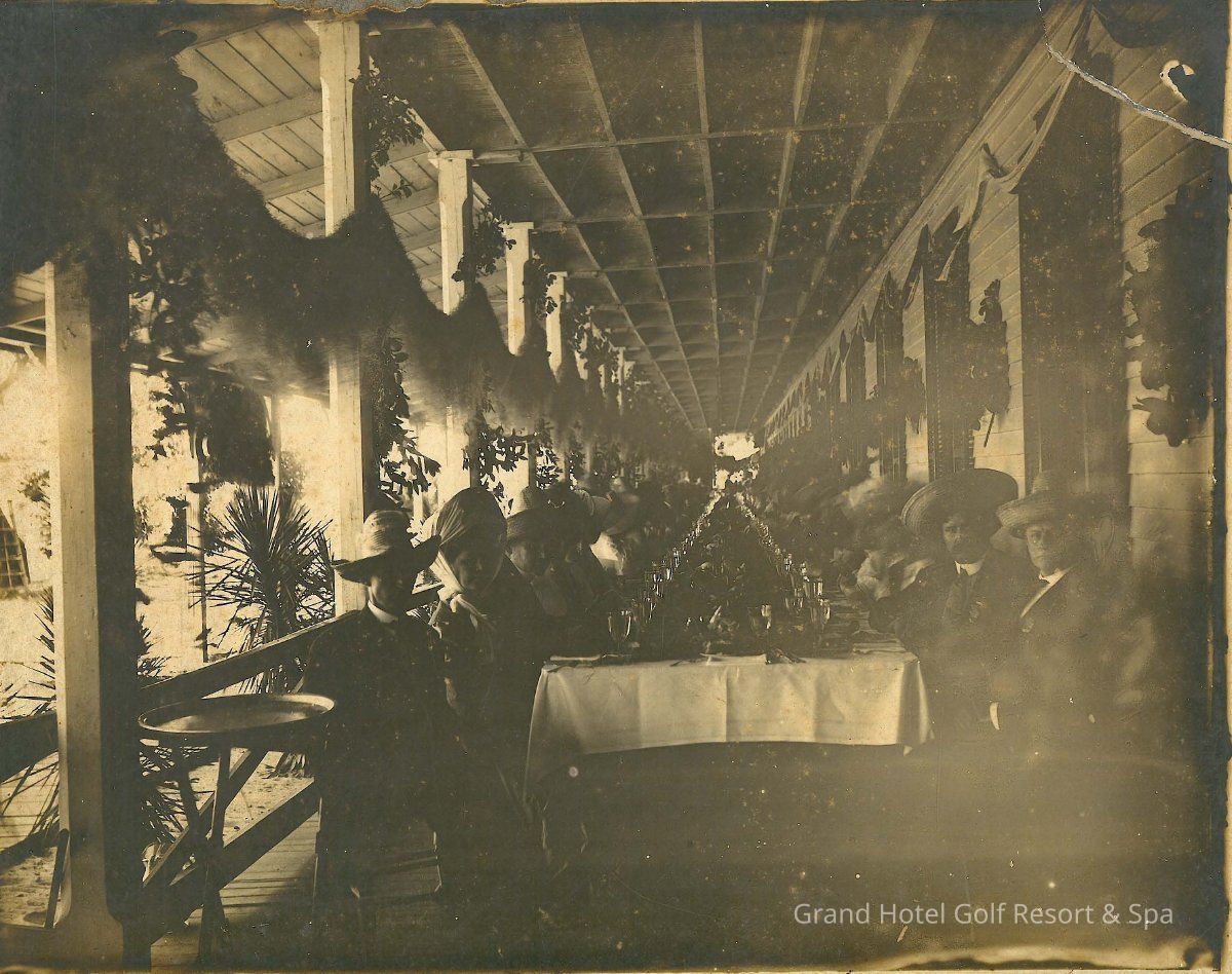 Photograph of a luncheon at the Grand Hotel in Point Clear, Alabama. Although the photograph is dark and damaged, details can be seen. The table is set with magnolia leaves decorating the length of the table, ladies are wearing large hats, water glasses sparkle in the photo and some plants can be seen on the open side of the setting. Image courtesy of the Fairhope Single Tax Corporation Online Archives.Create Date