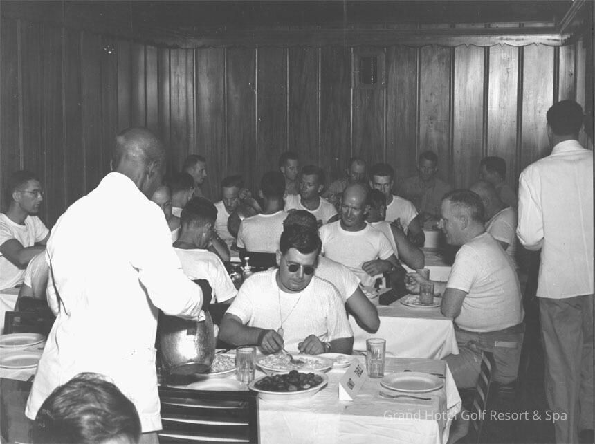 During World War II, the Grand Hotel was converted into a military training facility, known as Operation Ivory Soap. Lt. Col. Matthew Thompson is seated in the Grand Dining Room (the mess hall) in 1944.Description