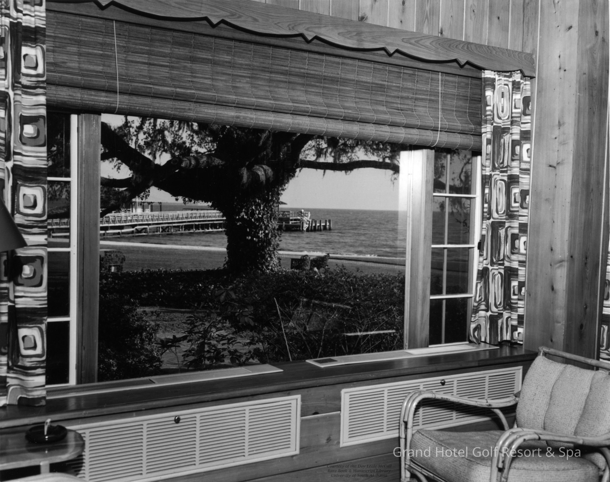 Corner Guest Room view at Grand Hotel circa mid-1950's, overlooking Mobile Bay and the fishing pier.Description