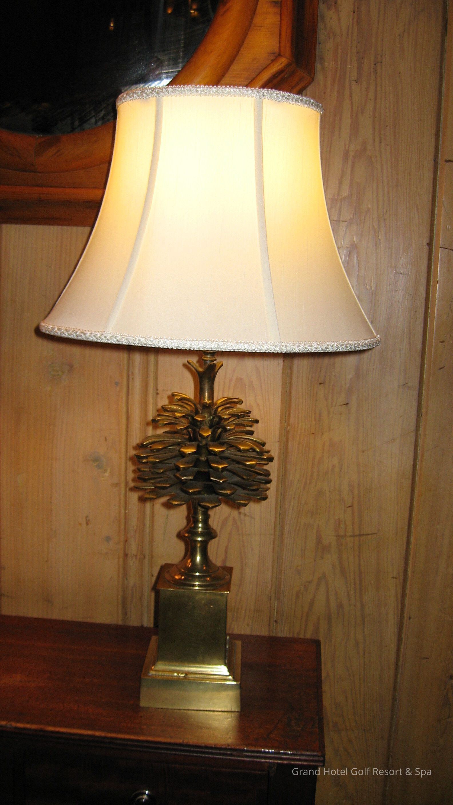 A pair of brass pinecone lamps have been part of the Main Hotel's (Building 1) decor for five decades or more; under the ownership of James K. McLean, the decorator totally decorated the lobby with antiques and Oriental rugs. These lamps are placed atop a small chest in the landing of the stairwell between the first and second floor.Create Date