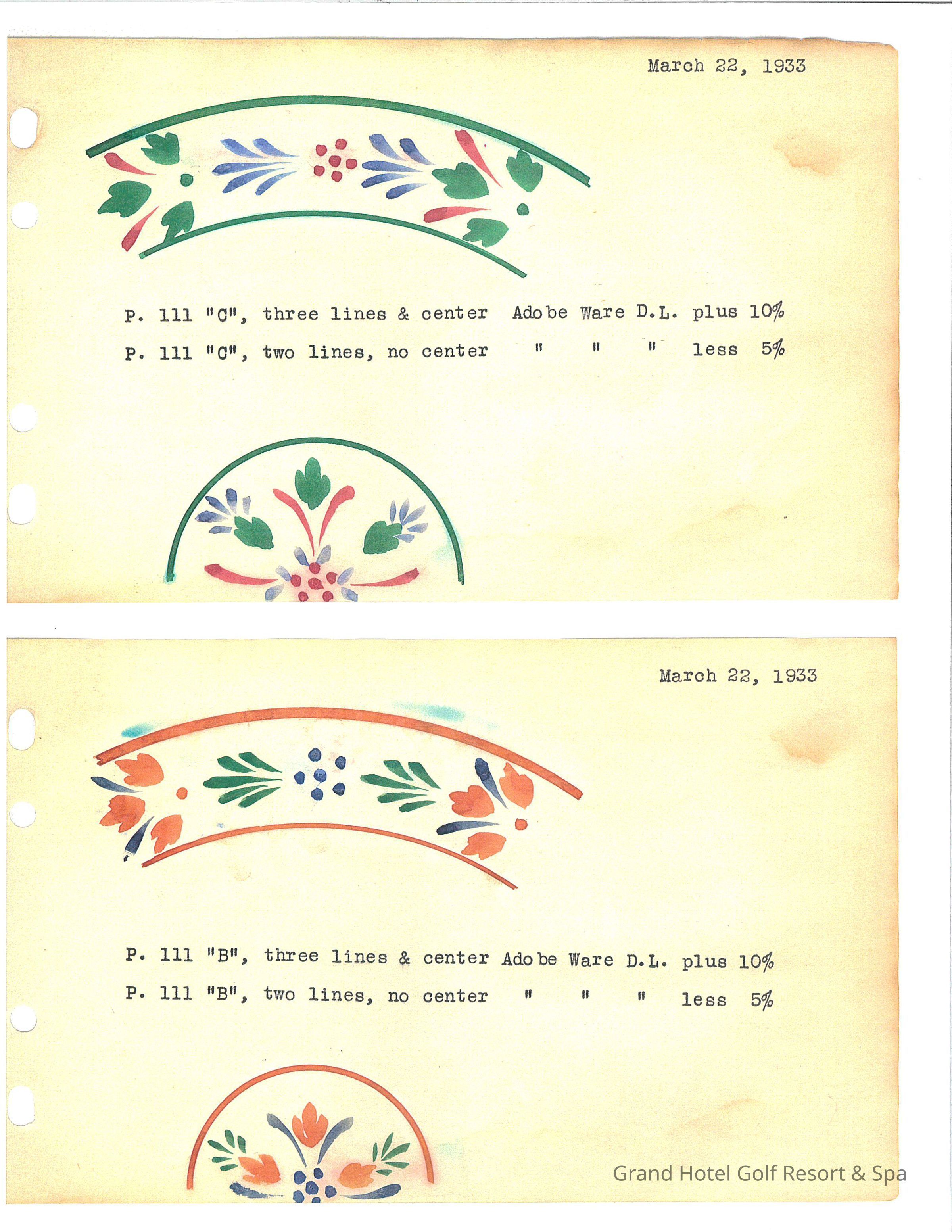 The Grand Hotel's first order of Syracuse China was placed in 1940, prior to its opening in April 1941; the last was in 1987 (this is the design page from 1933). Production and orders were interrupted during World War II. The pattern was first called Peasantry (P-111 series) and was hand painted; renamed Picardy in the 1980's and design applied with a printed decal.Create Date