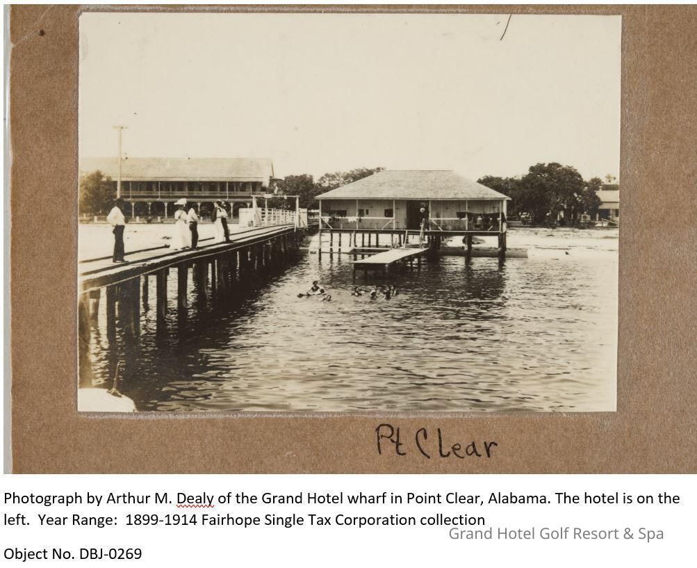 Arrival at Point Clear was primarily by bay boat (steamer); property owners provided their own wharf to accommodate docking. As some swim in the shallow waters of Mobile Bay, others stroll on the wharf in their turn-of-the-century attire. Separate "bathing" areas and bath houses were provided for men and women. The two-story Point Clear Hotel is on shore to the left of the wharf in this photo.Create Date