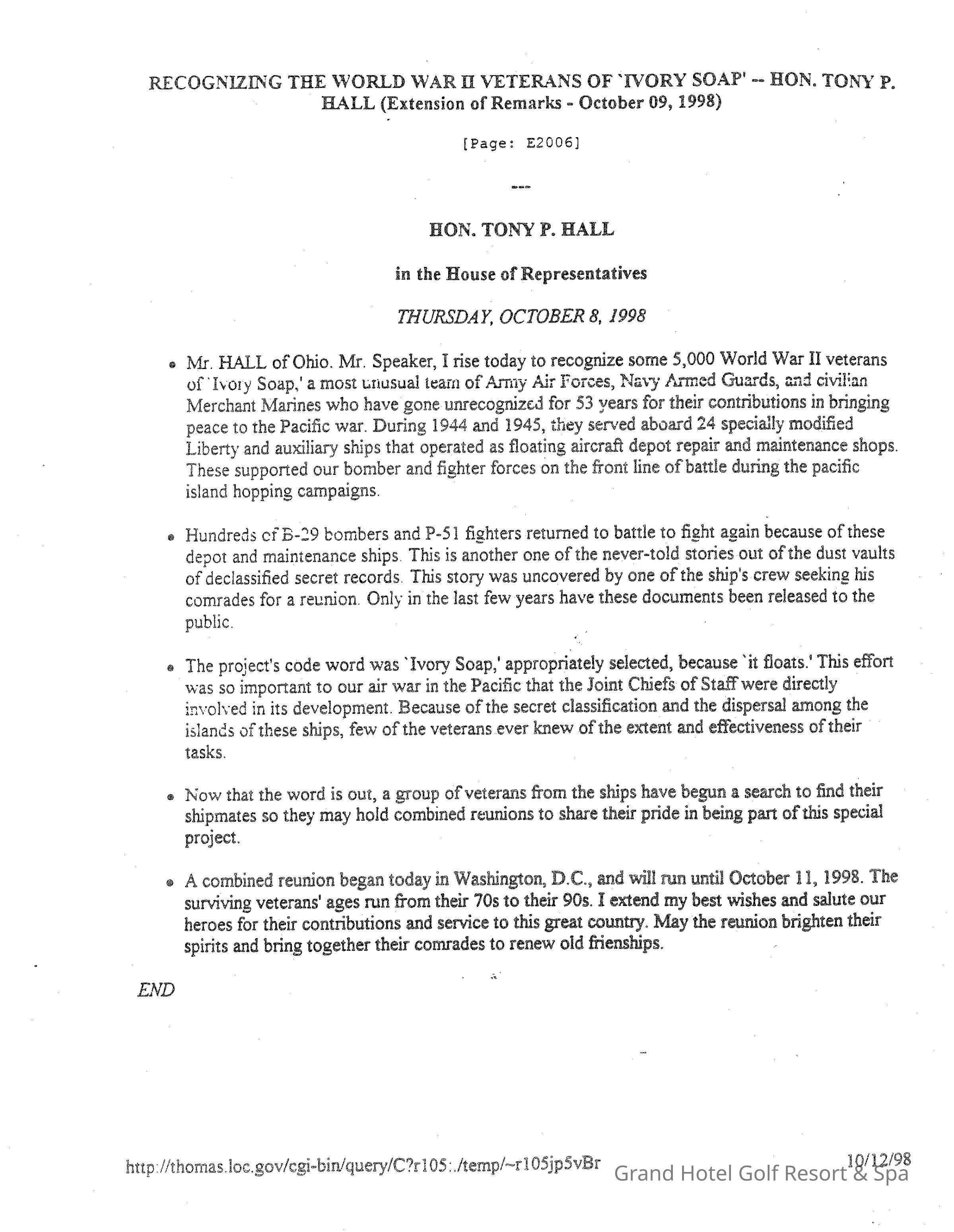 In tribute to the World War II veterans who trained at the Grand Hotel in a secrete mission named "Operation Ivory Soap," the honorable Tony P. Ball (US House of Representatives) told the story and paid tribute them, which became part of the Congressional Record on Thursday, October 8, 1998, the date of their reunion, in Washington, D.C. (page: E20061)Create Date
