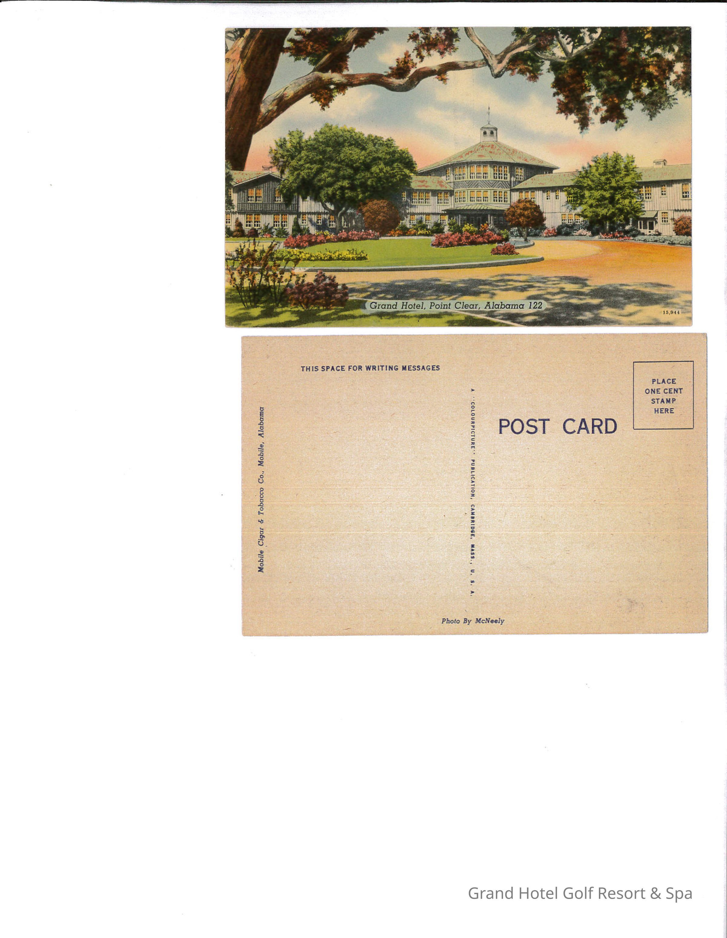 Iconic post card image of the main Grand Hotel in the early 1940's. The main entrance circular drive led up the front door. Photo by McNeely. Distributor was the Mobile Cigar and Tobacco Co.Create Date