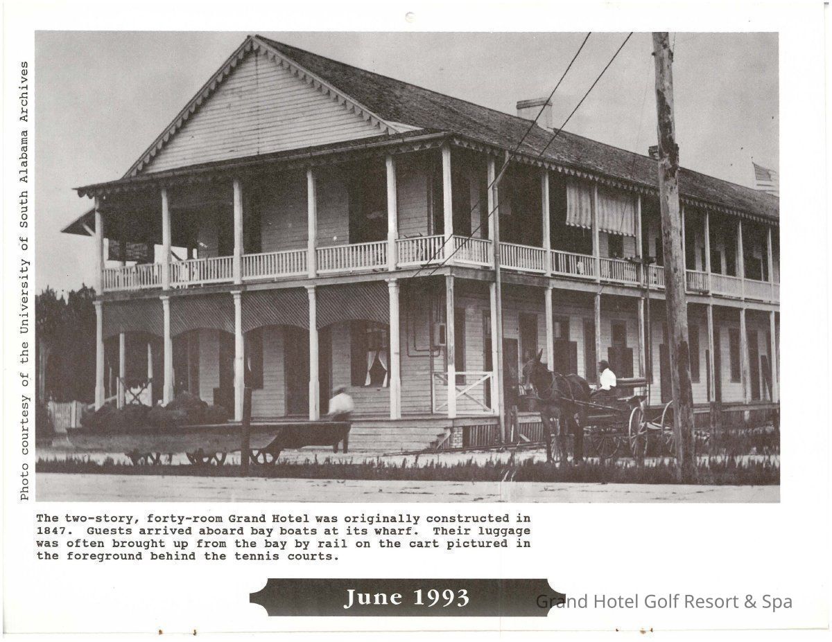 Photograph of the Grand Hotel (aka Point Clear Hotel) in Point Clear, Alabama. Guests arrive from Mobile via bay boats; their luggage sits on the rail cart where it has been brought up from the bayfront. The tennis courts are in the foreground. Image courtesy of the Fairhope Single Tax Corporation Online Archives.Create Date