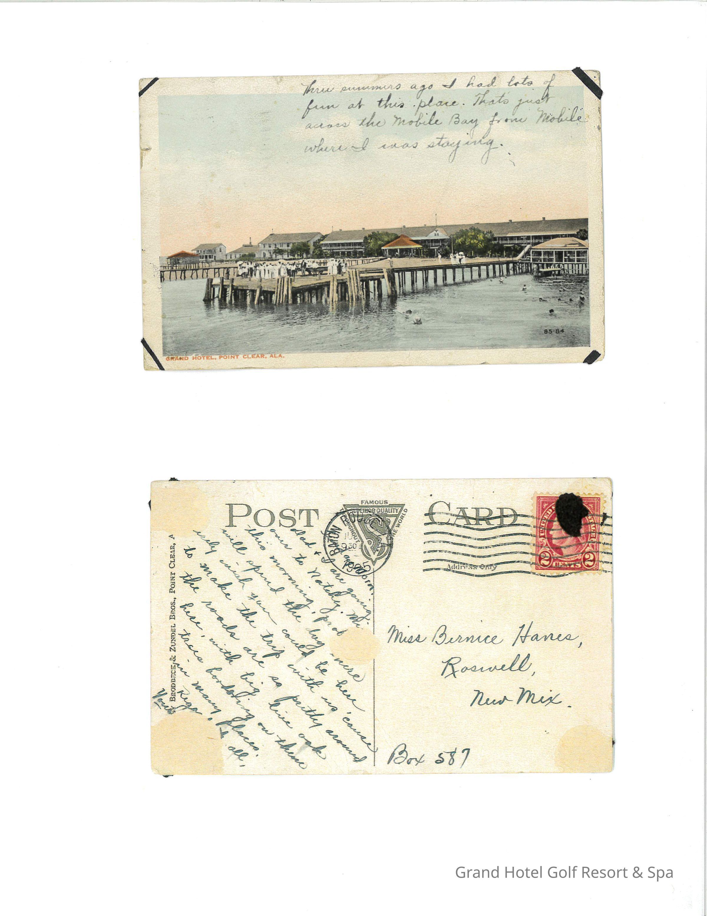 Post card of second Grand Hotel / Point Clear Hotel dated 1925. Image was from earlier in 1900's. Note people "bathing" in the waters adjacent to the wharf. The group of people gathered at end of pier may have just arrived by bay boat (steamer).Create Date