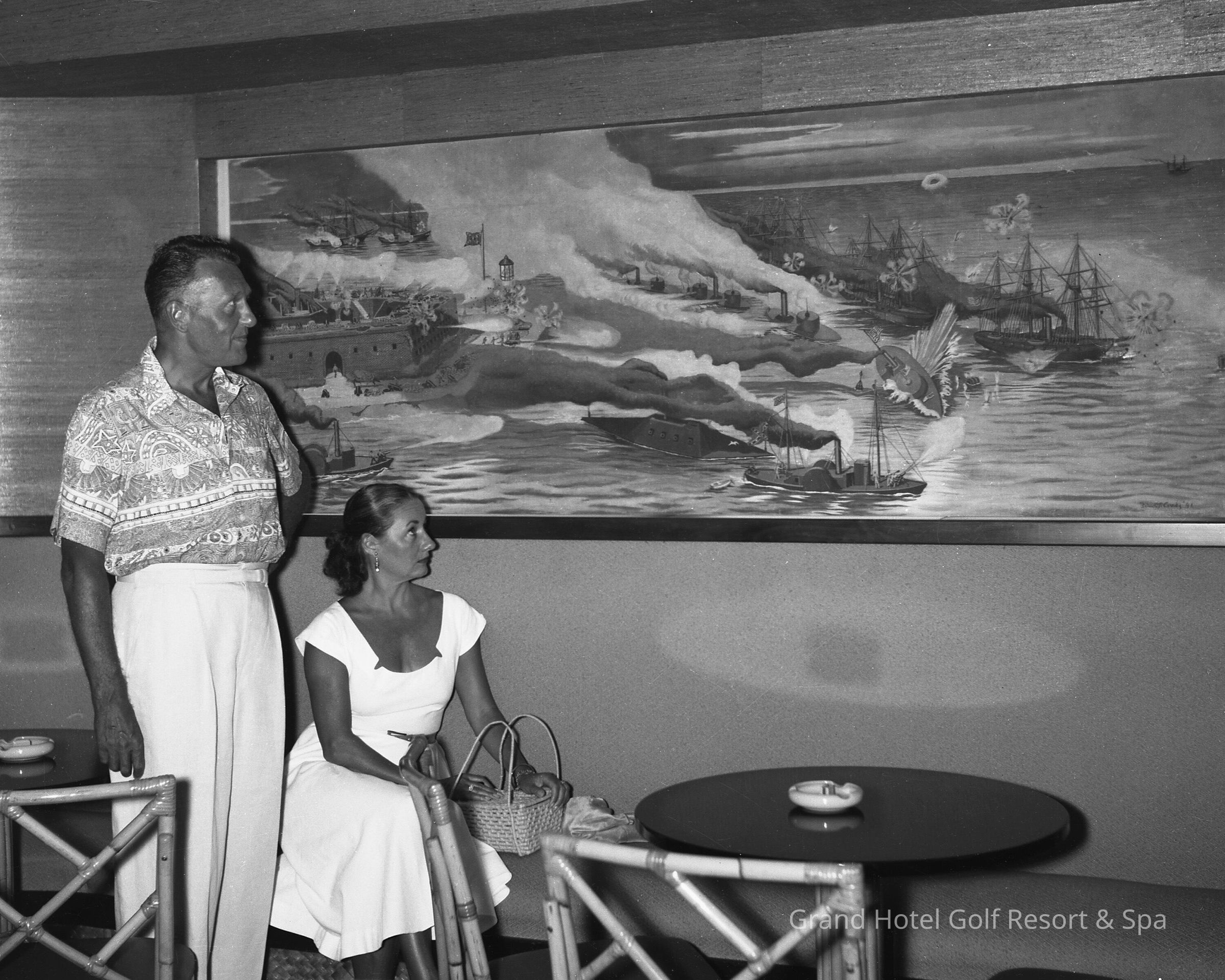 After E. A. Roberts purchased the Grand Hotel in 1939, he commissioned painting depicting the Battle of Mobile by New Orleans artist John McCrady. The large 7 ft. painting hung in the lounge, and later in the lobby at The Grand till the late 1980's.Create Date