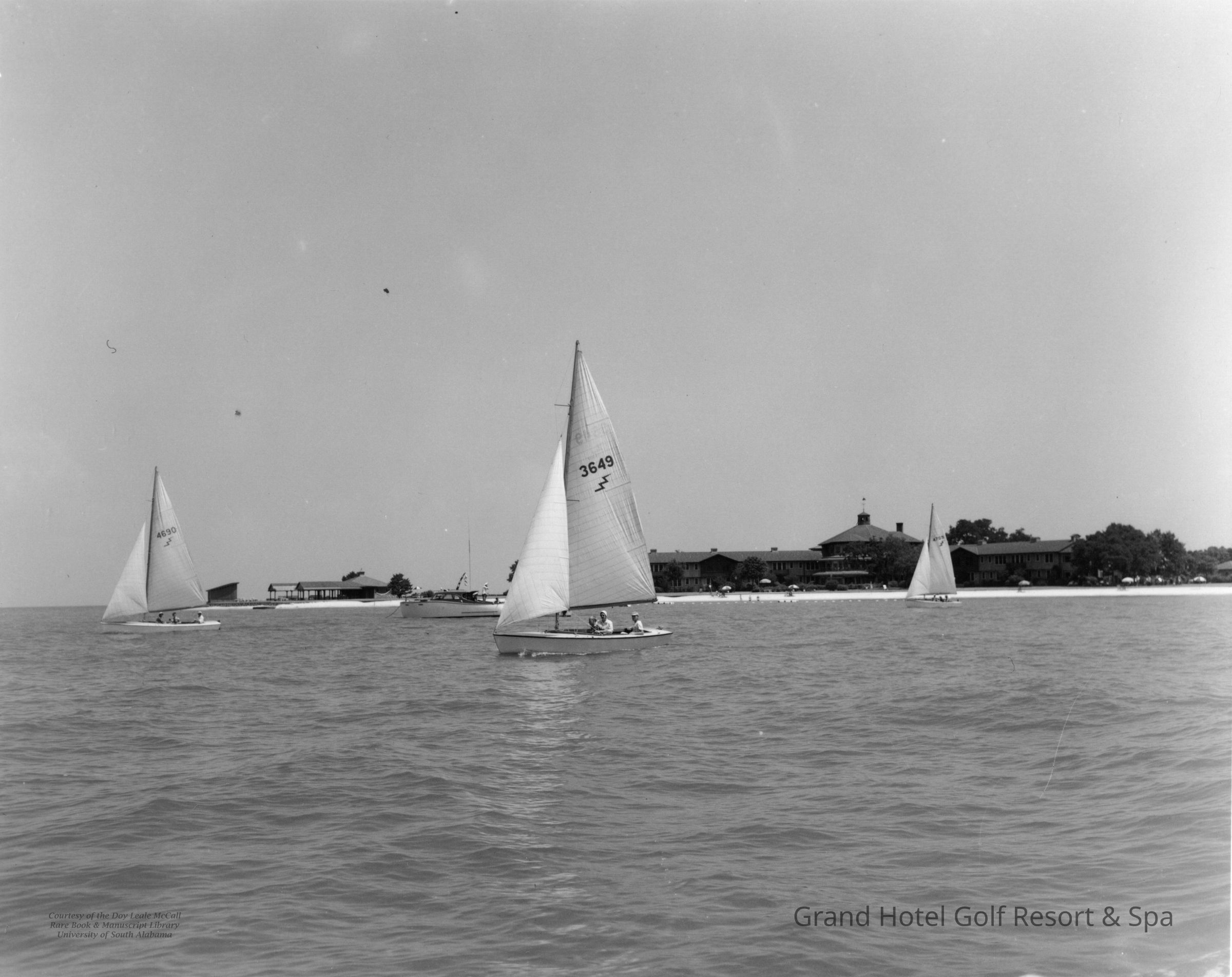 The Grand Hotel provided a small fleet of sailboats of various sizes for the guests' enjoyment on Mobile Bay. This regatta with Lightning class sailboats was most likely on July 4th in the late 1950's or early 1960's.Create Date