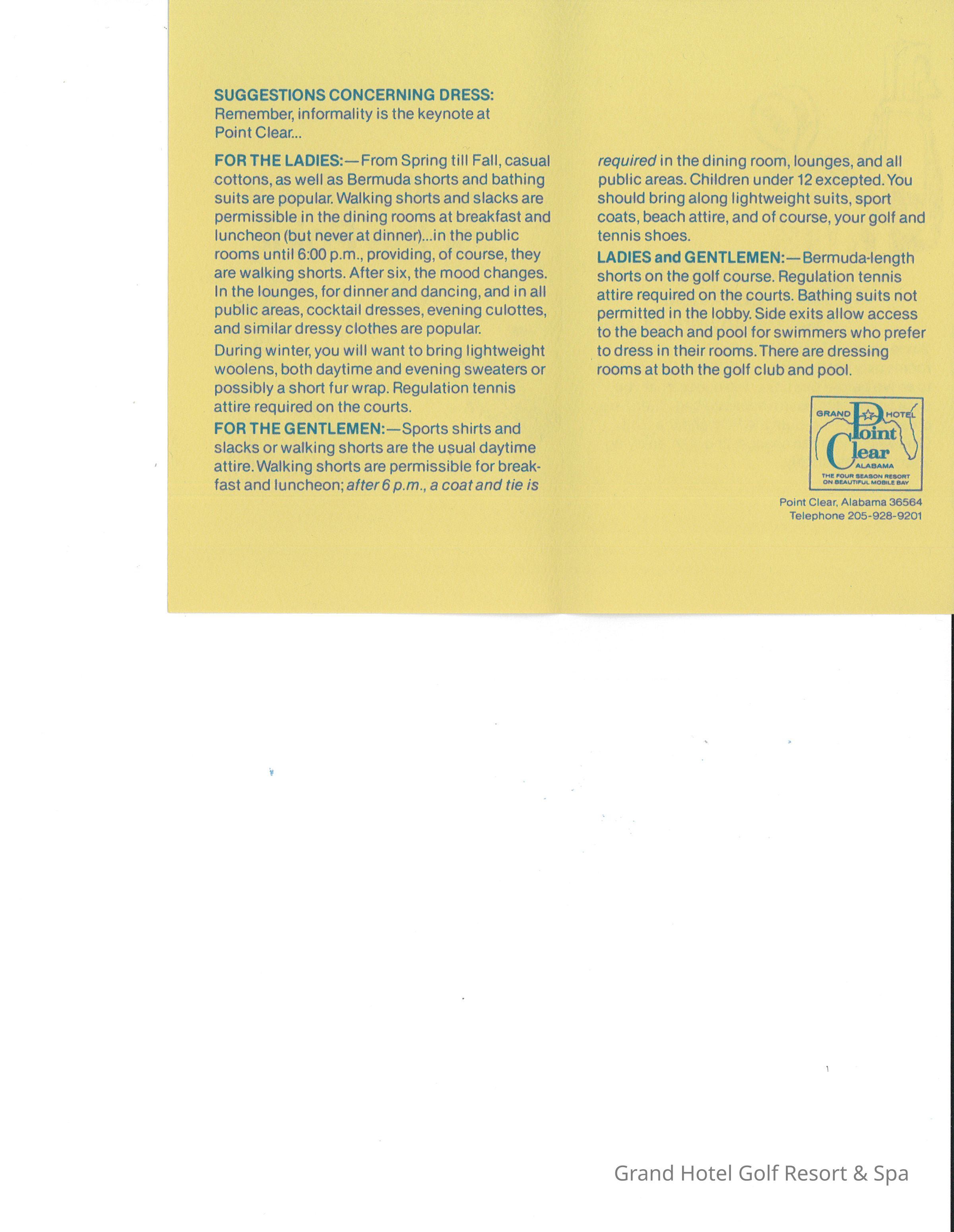 In this 1978 pamphlet, descriptions of proper attire are specified: a coat and tie for gentlemen was required in the dining room, lounges, and all public areas in the evening. Proper attire for ladies were cocktail dresses or similar dressy clothes after 6:00 p.m. The logo shows the Grand Hotel as located on the center of the Gulf Coast ... the "Four Season Resort on Beautiful Mobile Bay"Create Date