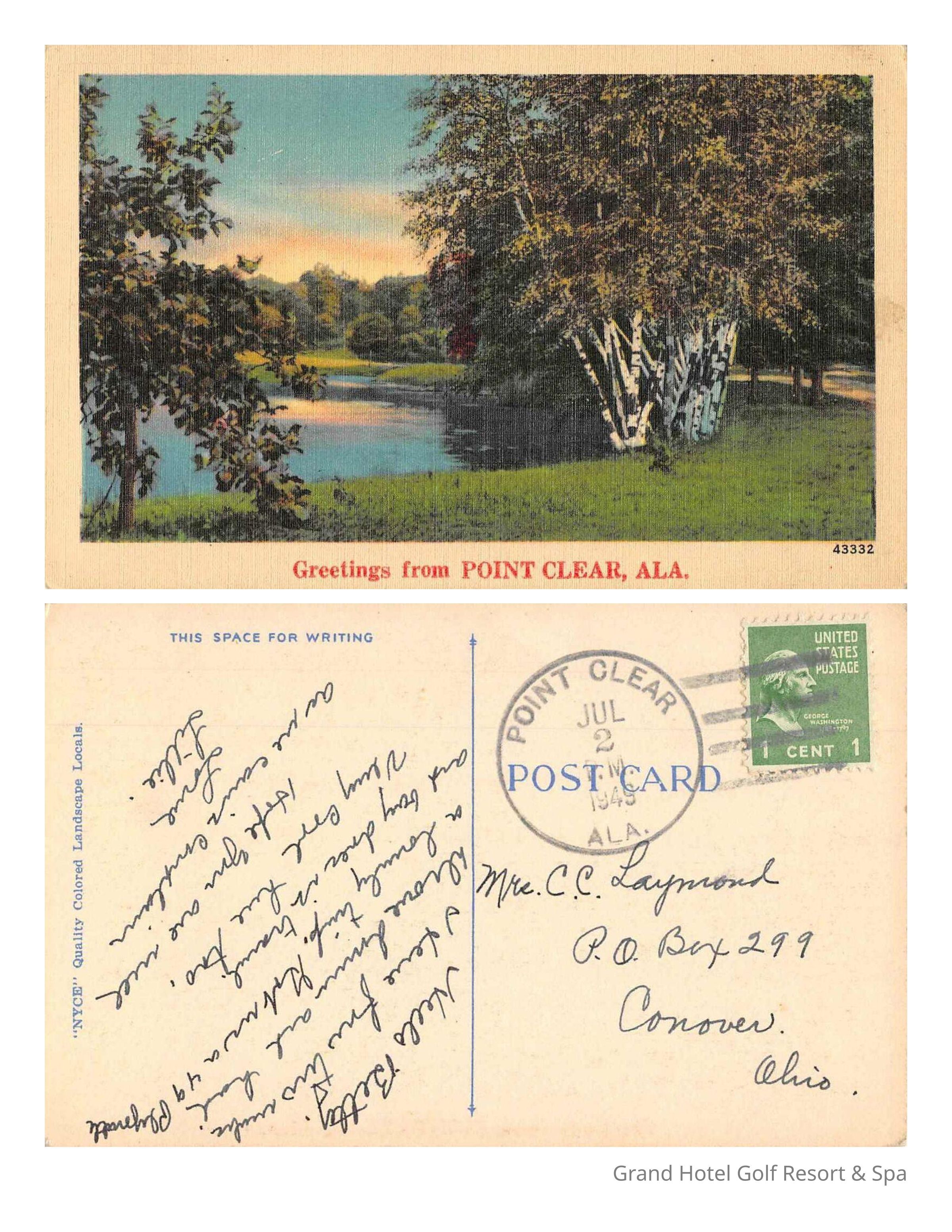 Post card from Grand Hotel, Point Clear, ALA dated July 2, 1949 - lagoonDescription