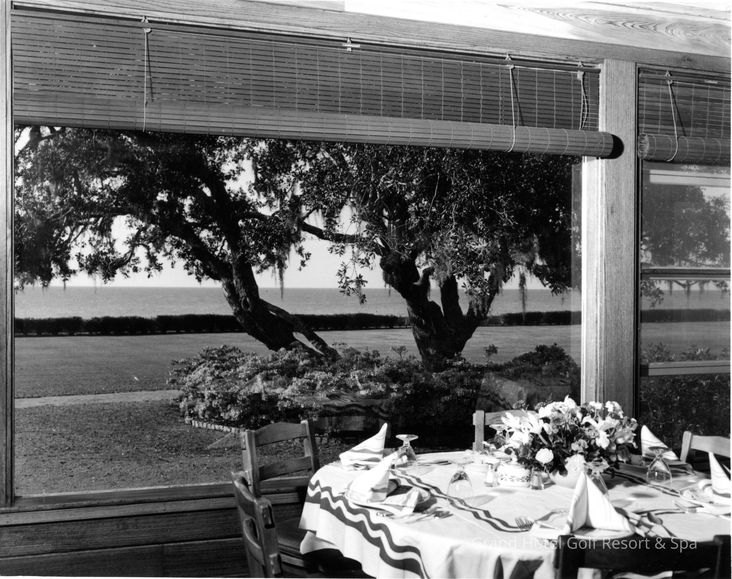 Dining has always been a memorable tradition at the Grand Hotel, allowing many lovely views of Mobile Bay. This table is set, complete with table linens and custom made china... Circa mid-1950's.Create Date